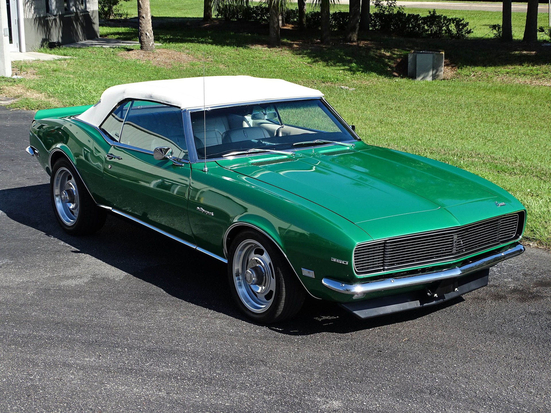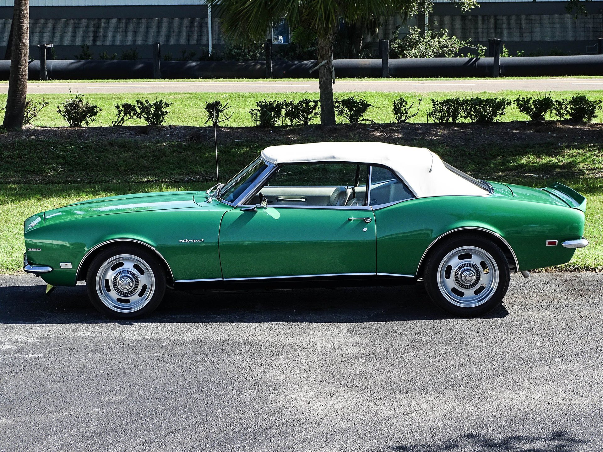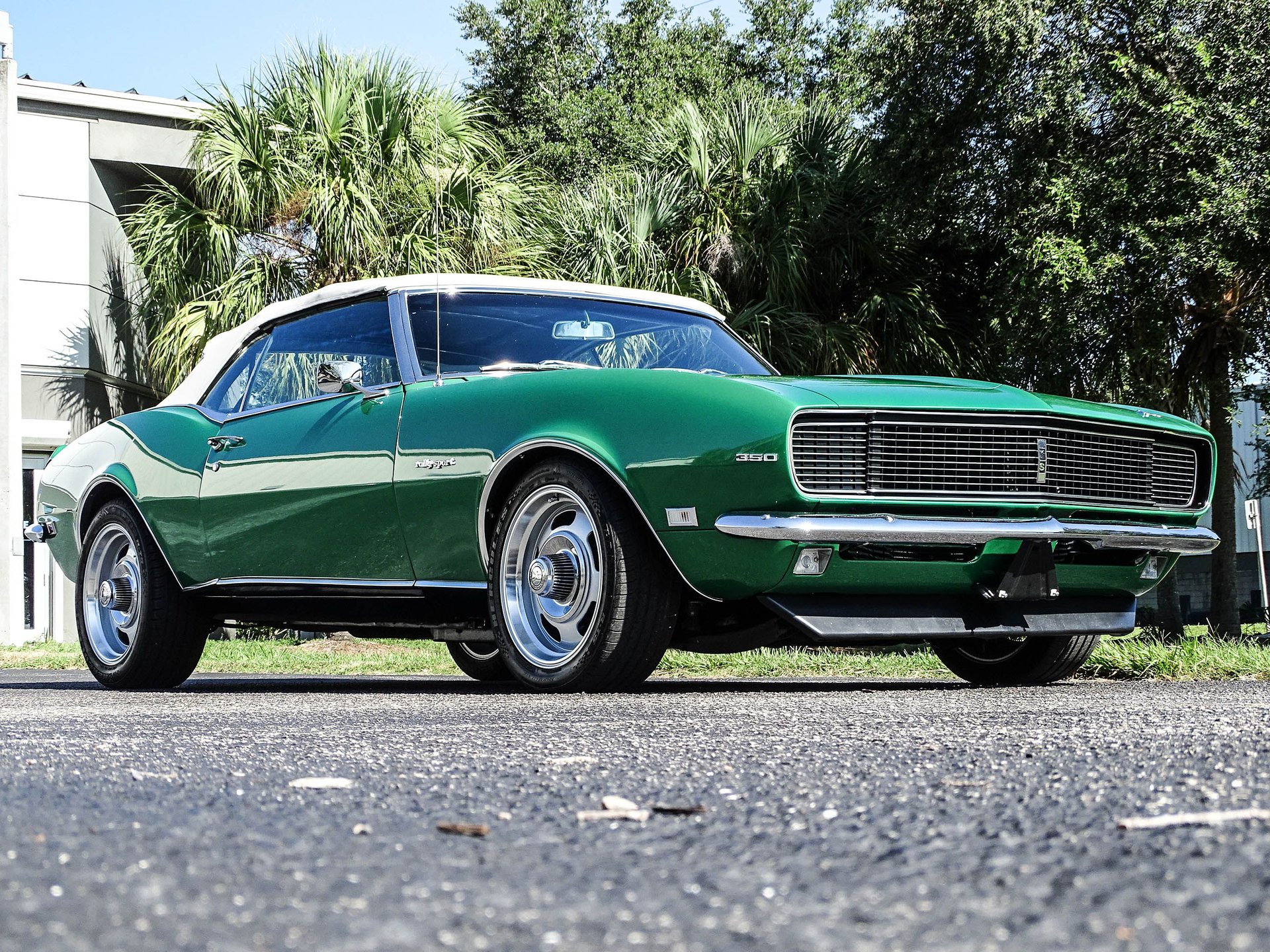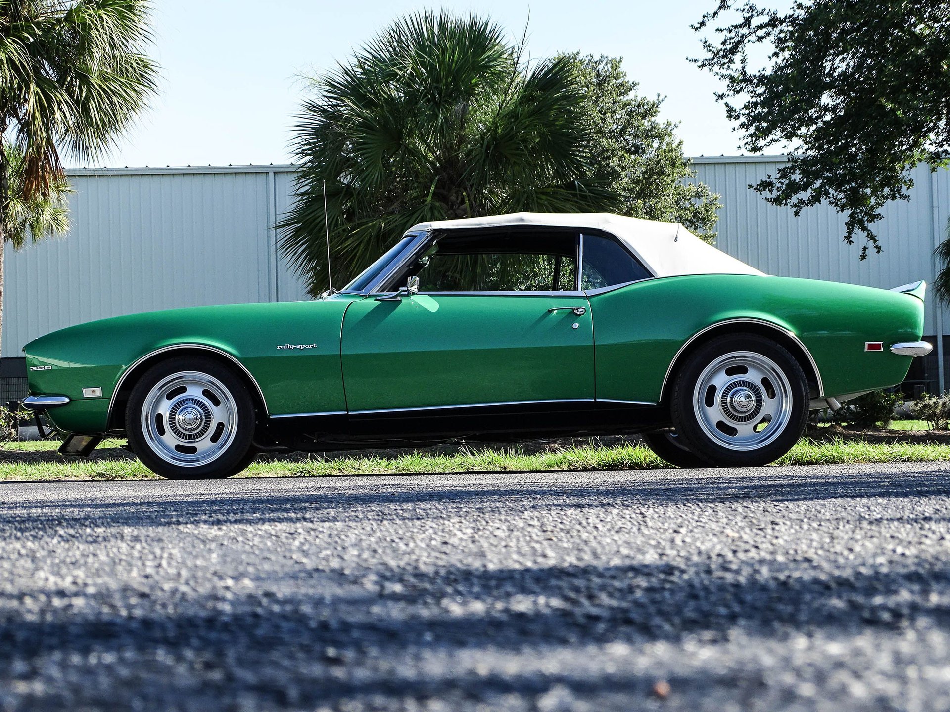 Take a gander at this stunningly restored 1968 Chevrolet Camaro RS tribute convertible! This beauty was restored in 2017 and has been garage kept since, and only driven on nice days. We have photos of the restoration that go with the car. Starting with the exterior, the Rallye Green paint with a white convertible top really catches the eye. The best thing about that is that it's the original paint color (J Code). Larger Rally wheels give this Camaro a bit of a modern flair and are sure to have people doing a double take. Those wheels paired with front and rear spoilers, hideaway headlights, and the Rally Sport rear valance, gas cap, and emblems make this a real show-stopper. Open the door and you will find white vinyl bucket seats, a center console, wood steering wheel, and the very popular tic-toc-tach. The interior is all new as part of the extensive restoration as well and looks great with Camaro embroidered floor mats. Under the hood is a crate 350 CID V8 with a rumble through the dual exhaust that is pure muscle car! The engine is a JEGS crate engine with a mild cam and 4-barrel carburetor. Power steering and power front disc brakes with drilled and slotted rotors make this car easy to drive and enjoy. There is just enough chrome under the hood to make you proud to show it off at car shows. The chrome air cleaner, chrome valve covers, and chrome alternator top off this clean engine compartment with a bit of flair. This Camaro is so clean, you could eat off the underside! With only 1,200 miles since the restoration was completed, this Chevy muscle car needs nothing but a proud new owner. Other new parts during the restoration included: tires, wheels, convertible top, battery, alternator, ignition, voltage regulator, and much more. The car also comes with the original steering wheel if the new owner prefers that look. Out of 235,147 Camaros built in 1968, only 16,927 were V8 convertibles like this one!