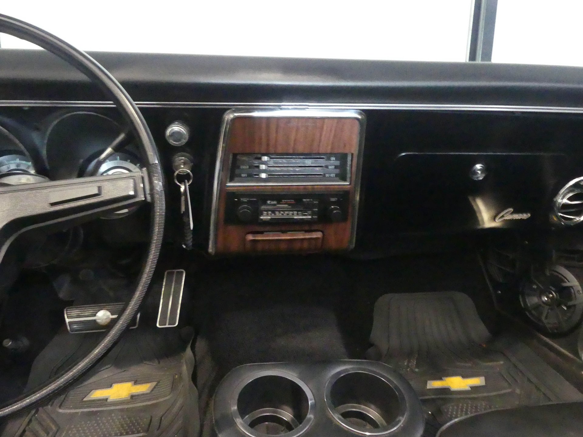 Step inside, and you're greeted by a time-capsule interior featuring pristine black vinyl bucket seats, a functional center console with handy storage and cupholders, and a vintage AM/FM/cassette player that adds nostalgic charm. The tilt steering column and rare column-shifted automatic transmission enhance both comfort and originality. With smooth power steering and responsive front disc brakes, this classic is as effortless to drive as it is stunning to behold.