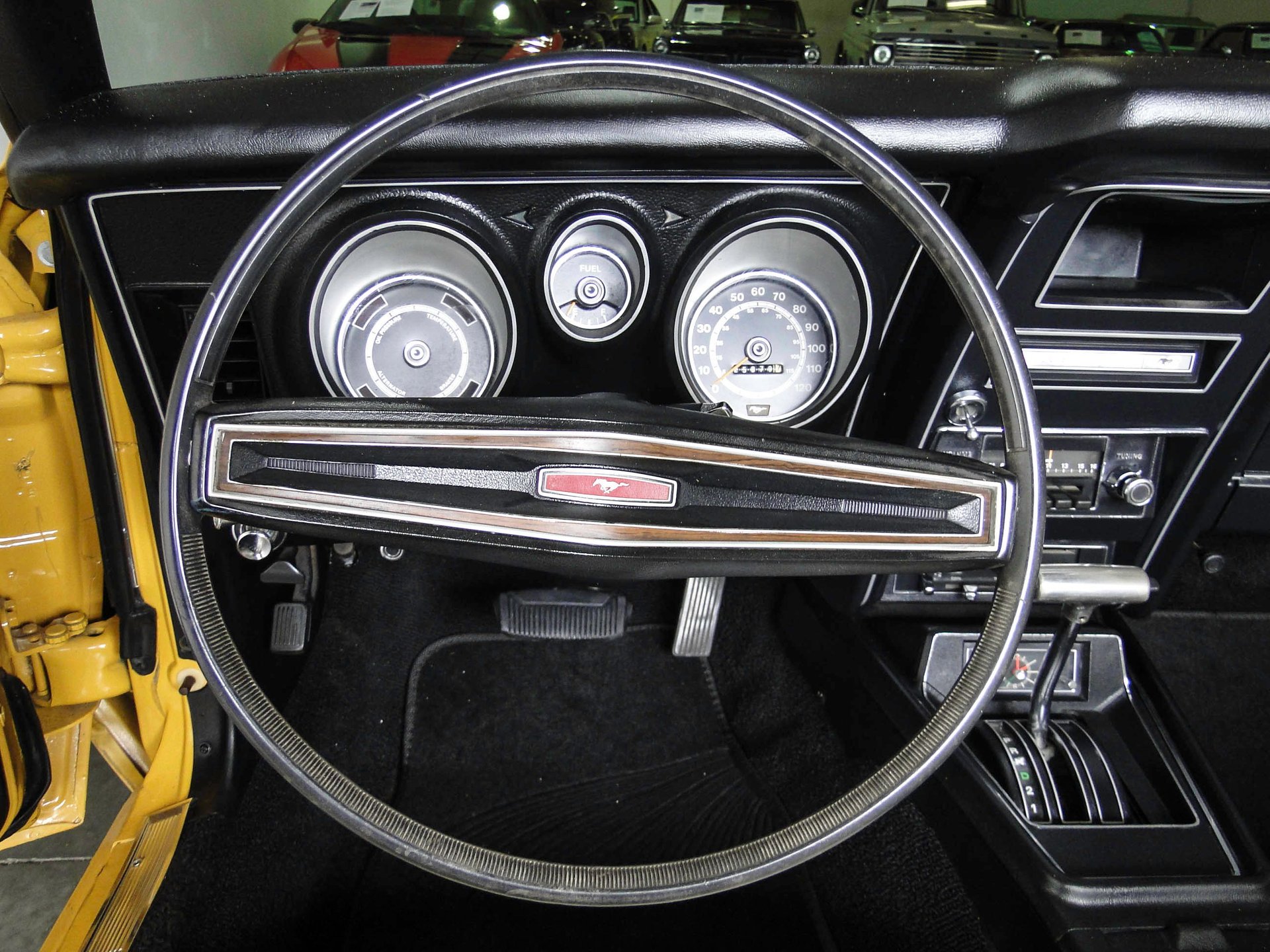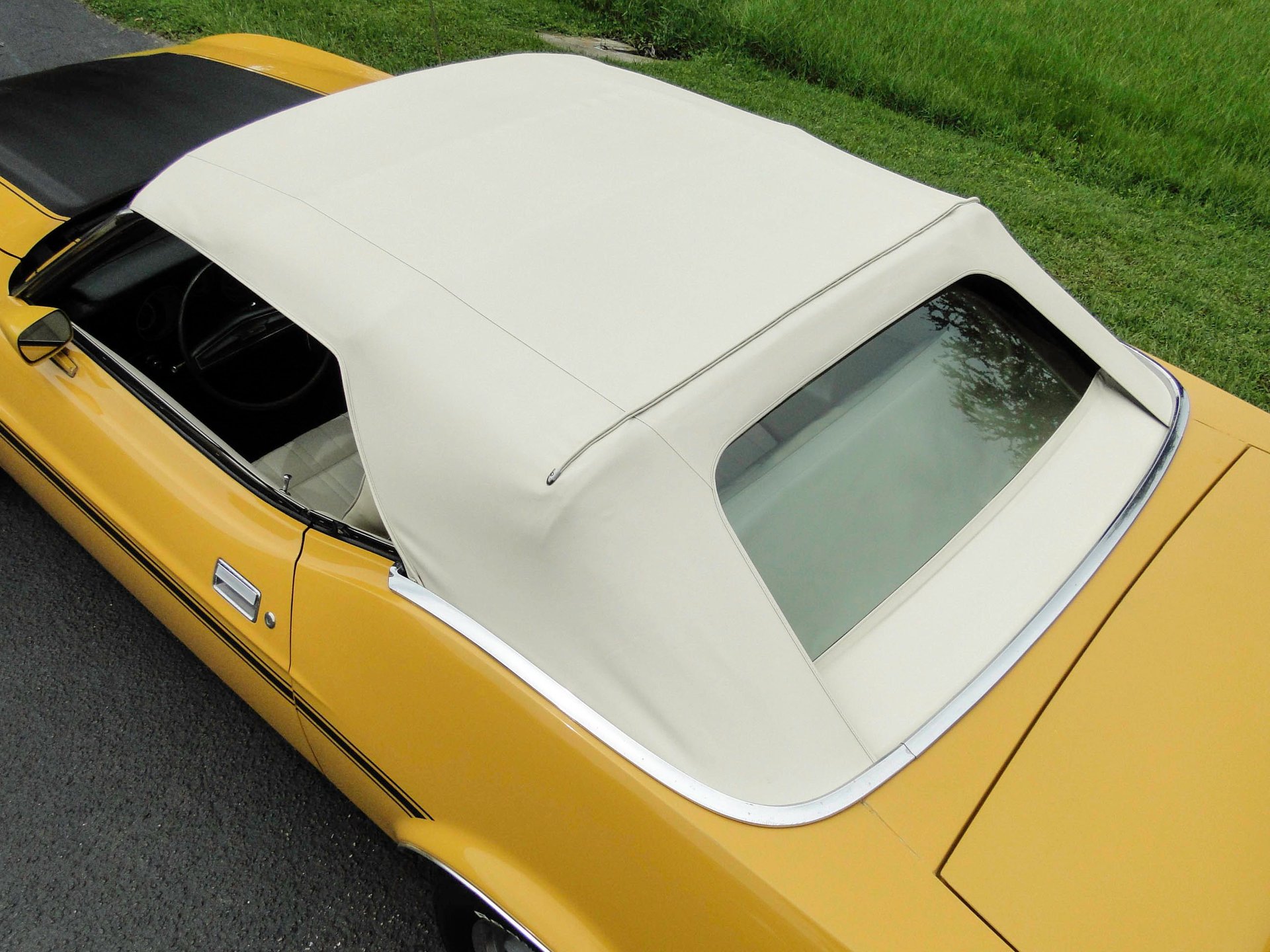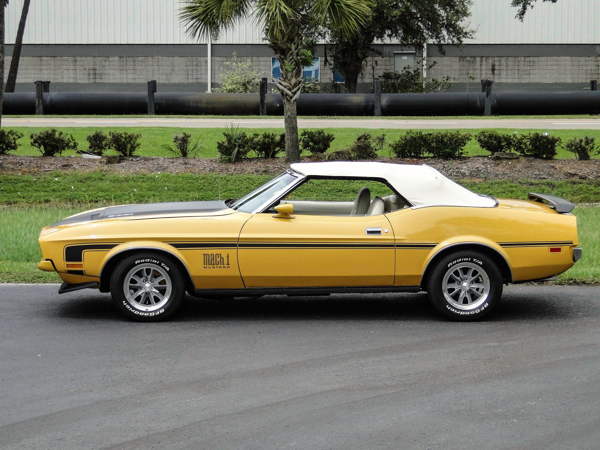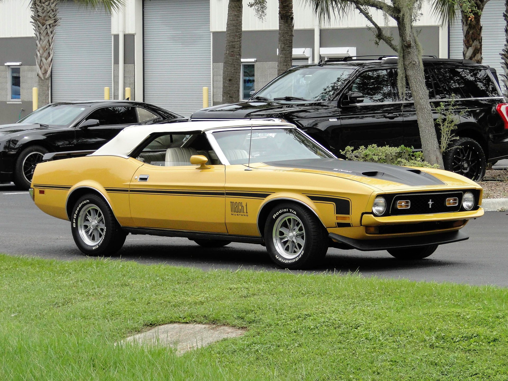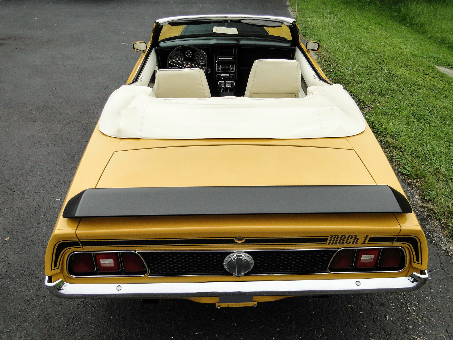 Cool, rare and fun are three ways you could describe this 1971 Ford Mustang Convertible with Mach 1 styling. It's cool simply because it's a Mustang, a muscle car, and a drop top all in one. It's rare since ford only produced 6,121 convertibles in 1971. Only 884 convertibles had the H-code 351 engine paired with an FMX transmission. Even more rare, only 27 total Mustangs in 1971 were painted Medium Goldenrod Yellow with a CA trim code! The 351 Cleveland under the hood breathes through a Mach 1 style hood with open air cleaner and purrs through dual exhaust with chrome tips. It rests in a very nicely detailed engine compartment with power steering. That V8 is mated to an FMX automatic transmission and then connects with a Ford 9” rear end to put the power to the ground. Inside is in great shape with white knitted vinyl bucket seats with a center console. Mach 1 stripes and 15” Halibrand style alloy wheels with real knock-offs give this car a very muscular profile. The brake calipers have been painted yellow as well and look great peeking through the wheels. Front and rear spoilers and bold Mach 1 decals finish off the look, making this car attractive from every angle. The trunk is nicely finished with a correct trunk mat, jacking instructions sticker and spare tire. This Mustang was restored in 2007 and has been driven less than 1,000 miles since the restoration was completed. Don't miss your chance to own this one of a kind collectible Mustang convertible.