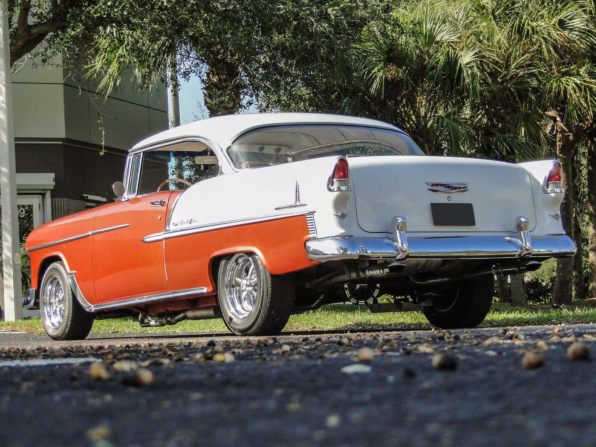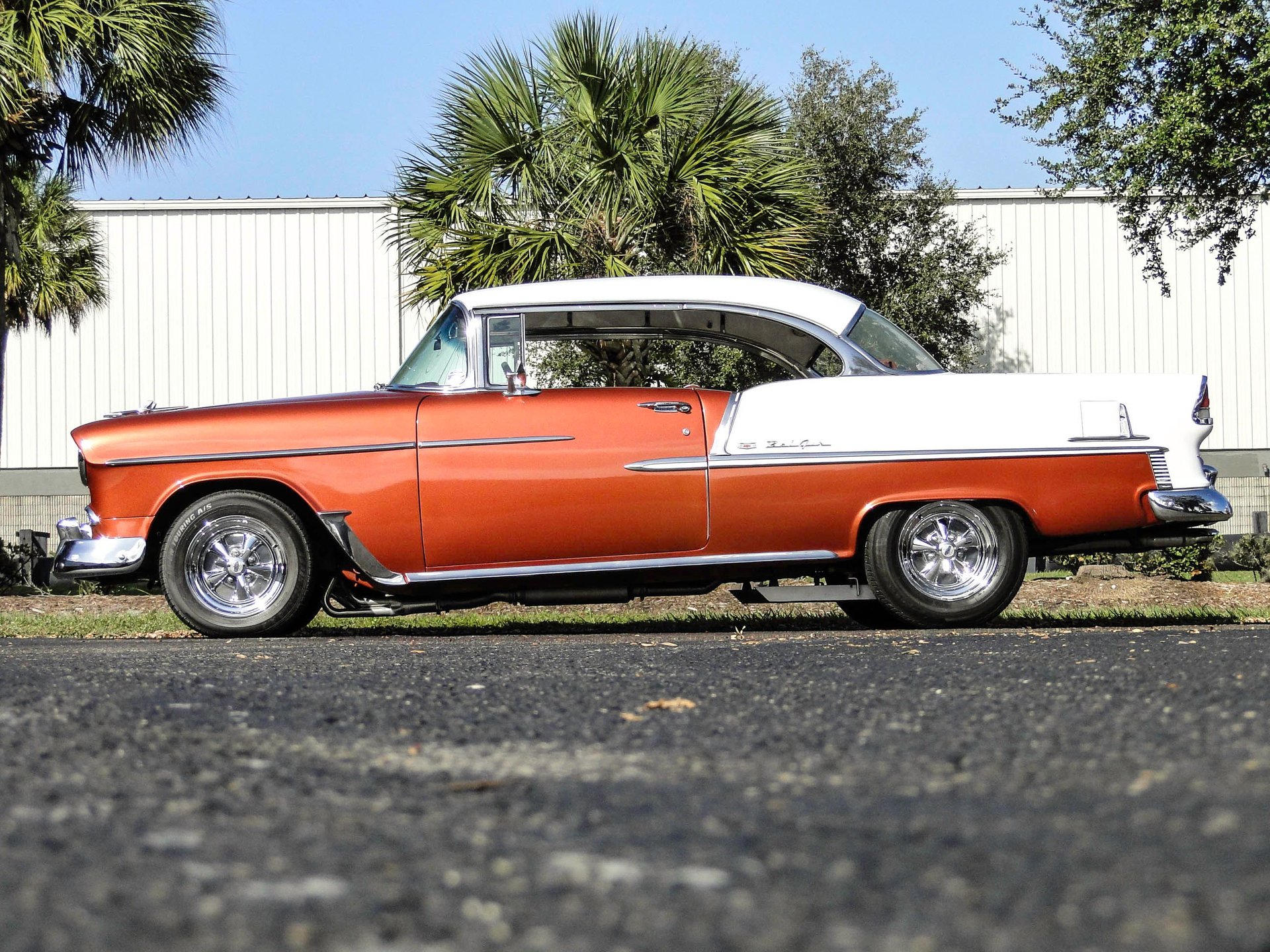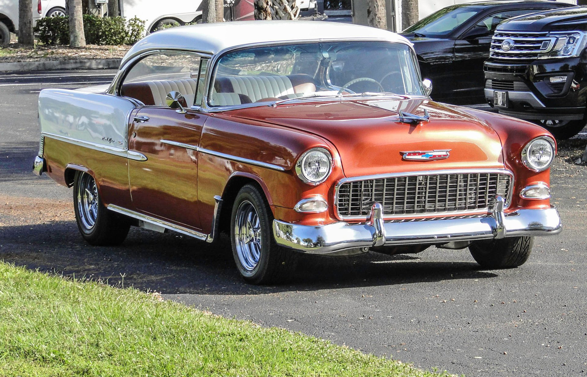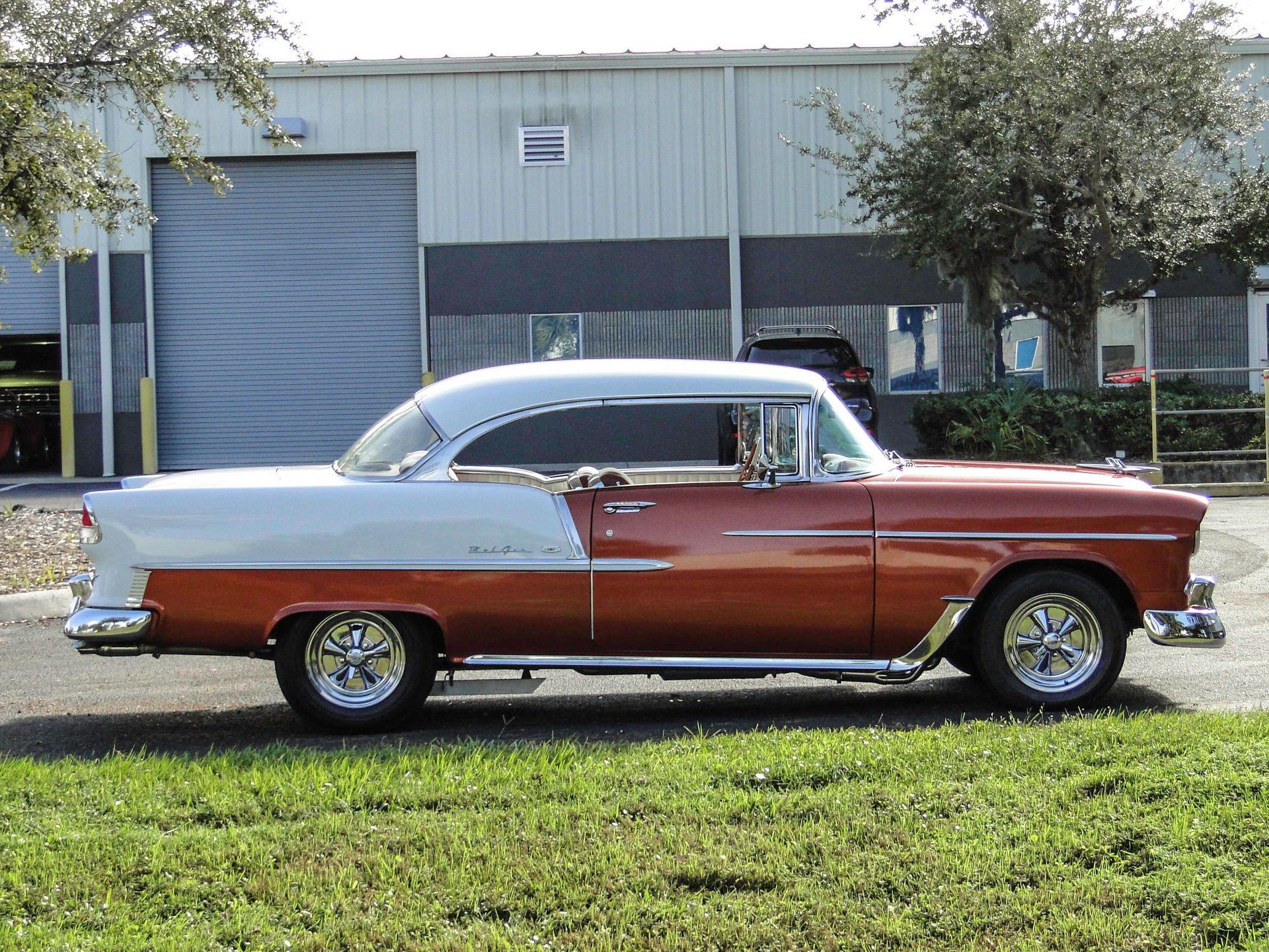 Check out this 1955 Chevrolet Bel Air 2-door hardtop street rod! This is a real attention getting in Bronze Metallic paint paired with classic white. Chrome Cragar SS wheels with chrome backers and a hot rod stance will make this Tri-Five the envy of any car show. Under the hood sits a mildly built 350 CID V8 engine with Edelbrock carburetor, polished intake, Mallory ignition and ceramic coated headers. The engine is kept cool by a Griffin aluminum radiator with dual electric fans. Everything about the engine compartment is ready to show! Polished inner fenders, polished pullies, chrome valve covers and air cleaner, chrome brake booster and master cylinder and more! How about a Tremec 5-speed manual to back up that V8 powerplant? That's right! This Bel Air leaves you in control of the shifting. With power steering and power disc brakes, it is very easy to drive while you slam through the gears. A 12-bolt rear end with chrome differential cover handles putting power to the ground and looks great doing it. Traction bars have been added to eliminate any axle hop. The inside is custom, but not over the top. With bucket seats, an Impala steering wheel, custom gauge cluster, chrome glovebox door, modern AM/FM/AUX/USB player in the dash and a custom center console it is comfortable and sure to draw stares. The upholstery is nicely done in Bronze and White to match the paint scheme. A custom shifter handle has been installed and is topped off with a white Tremec shifter ball. It gives a classic hot rod look, right up until people realize it shows a 5th gear! The trunk is clean and simple with a spare tire and carpet to match the interior. Vintage Air A/C has been added and is a great addition for summer cruising. This is a Canadian built Bel Air, which is a neat backstory for people at car shows and cruises. The 10-37D on the cowl tag lets you know it was a Bel Air from the factory. This Bel Air received a full restoration just 3,127 miles ago and needs nothing but a new driver. It comes with full documentation for the build and has a clean and clear Florida title.