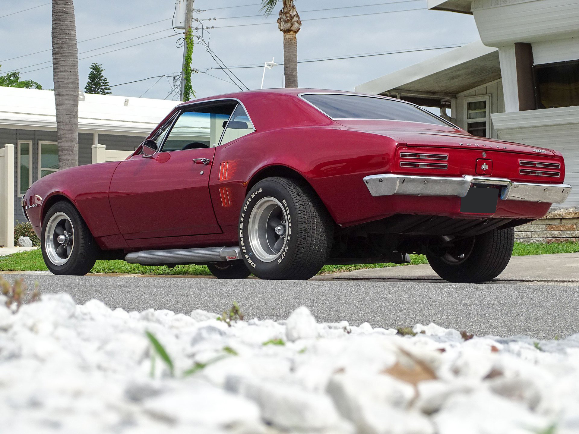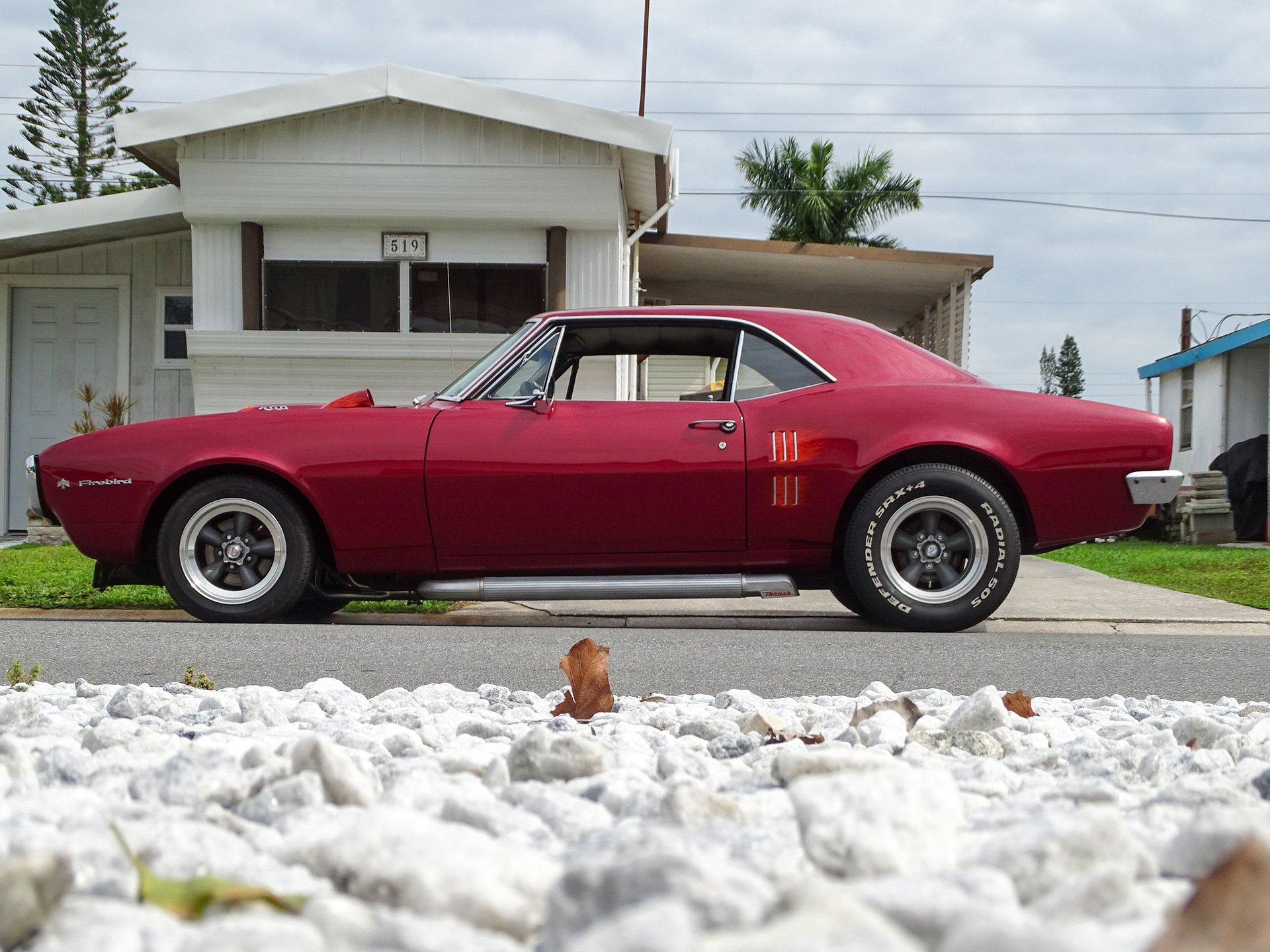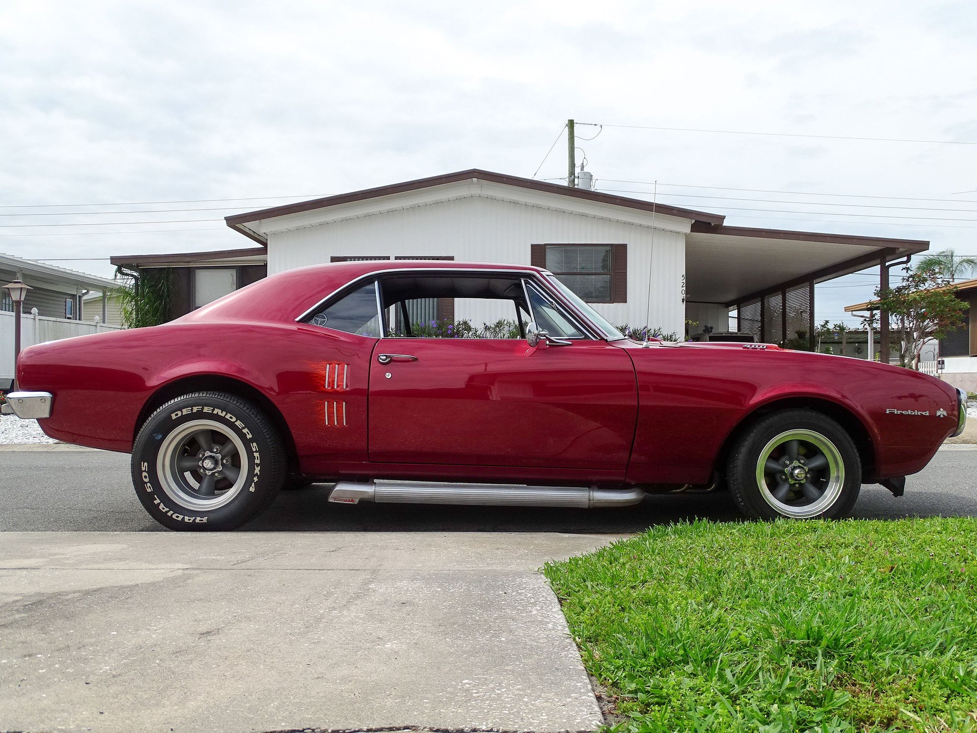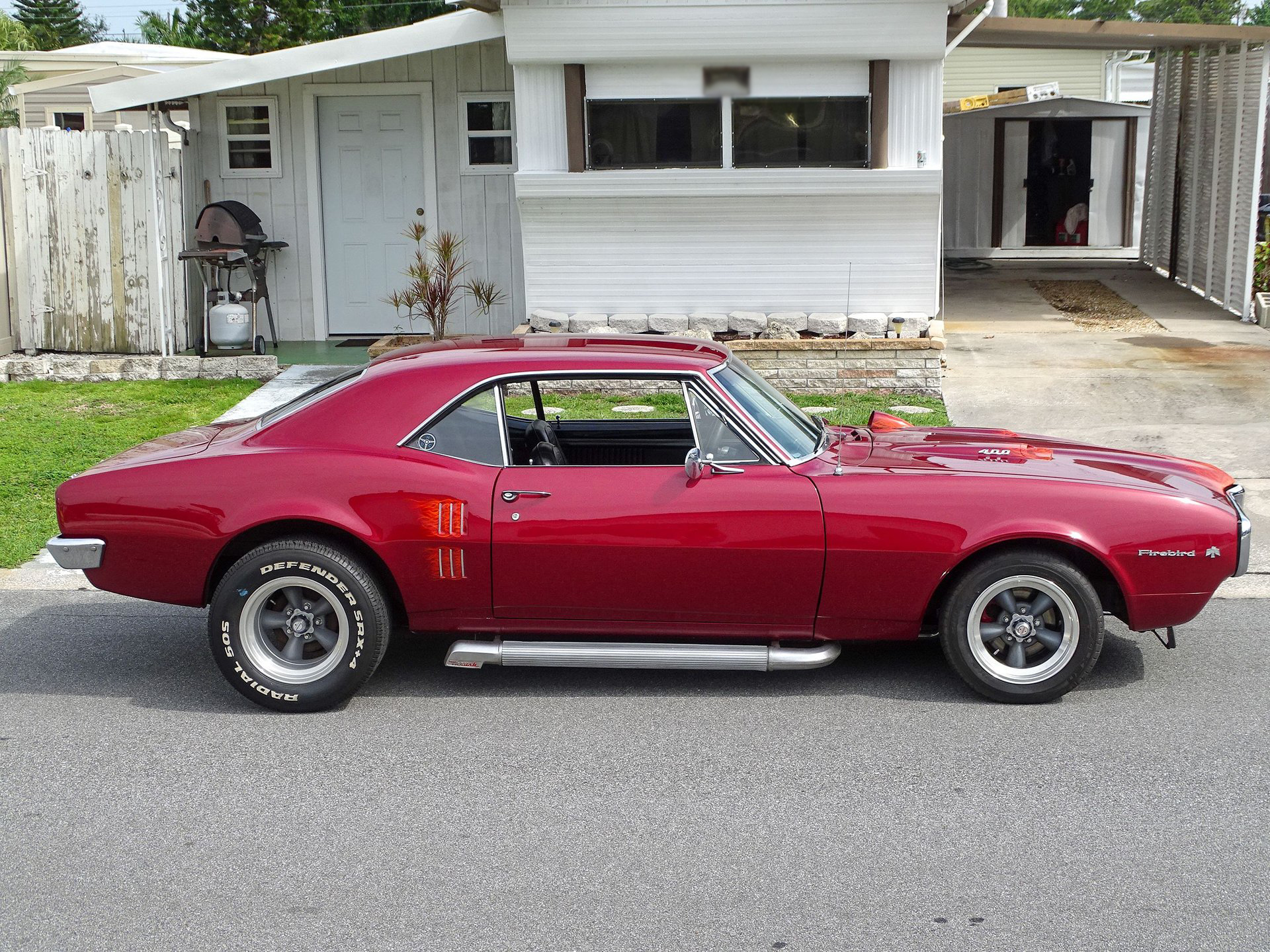 First Generation Firebirds are incredibly cool and have been gaining in value and appeal in recent years. They are the sister car to the Chevrolet Camaro but have a look that is uniquely their own. The chrome grill with dual headlights on each side scream 1960s muscle car! In the rear the taillights are also different from the Camaro and are divided with a Firebird emblem and Pontiac badging. It has a sex appeal that ties in nicely with the sleek look achieved by the front spoiler and rally wheels. Firebird script on the fenders and Firebird emblems on the quarter panels ensure people will know what they're looking at from any angle. Under the hood is a 383 Stoker CID V8 engine with a 4 barrel carburetor connected to an automatic transmission running to a 10-bolt rear end to complete its powertrain assembly. This Firebird has full-length headers and side pipes. Inside is complemented with Midnight black interior and comfortable bucket seats. The Firebird is simple and clean, painted in a gloss red complimented with painted orange ghost flames. Under the hood is raw power with a 383 Stroker engine and side exhaust pipes to give an aggressive stance while turning heads. The Firebird has a great classic muscle car sound to go along with the stance, body lines and wheels. Red gloss paint with ghost flames is always good on a classic car and the black interior plays very well off of it.
