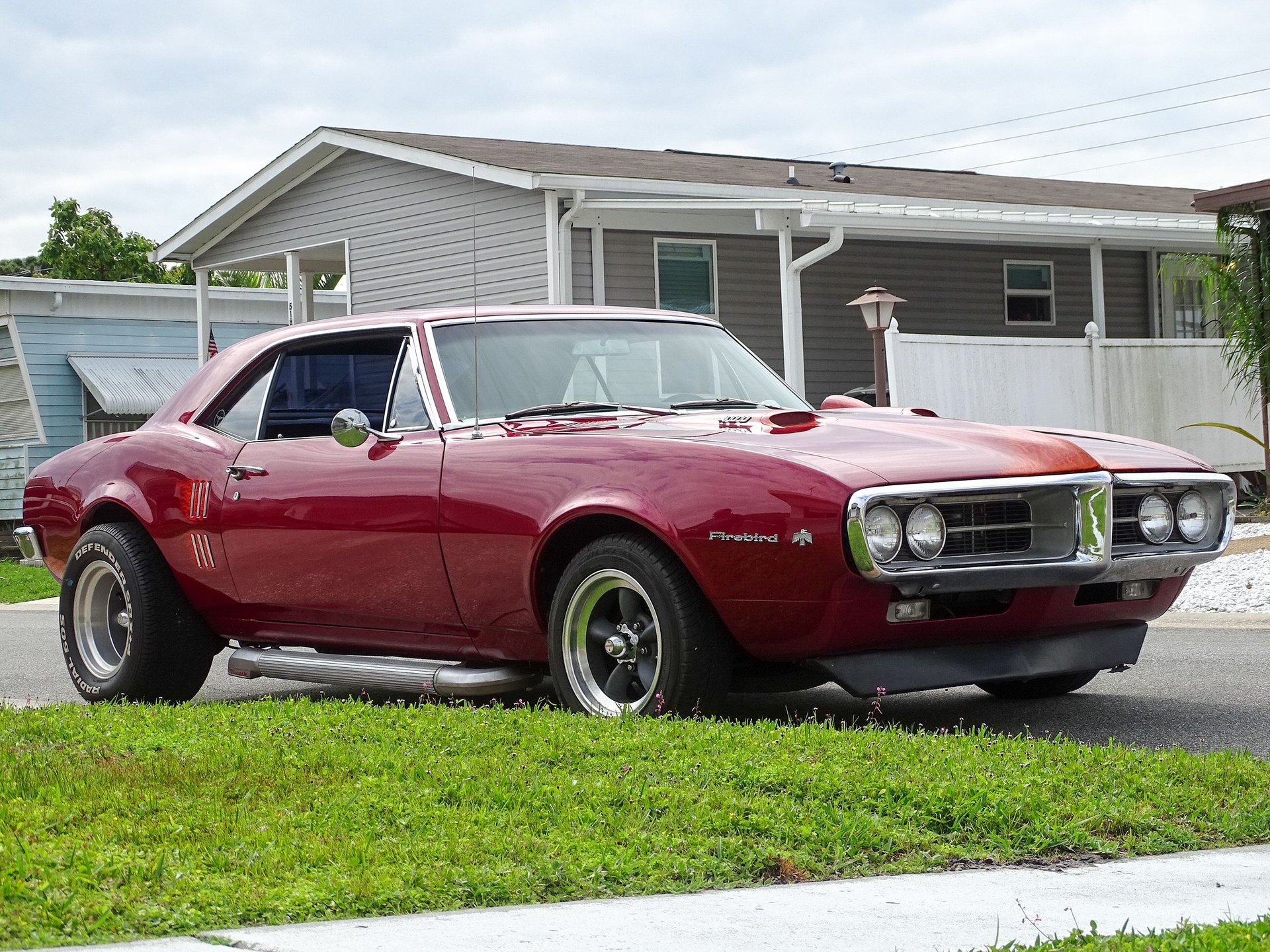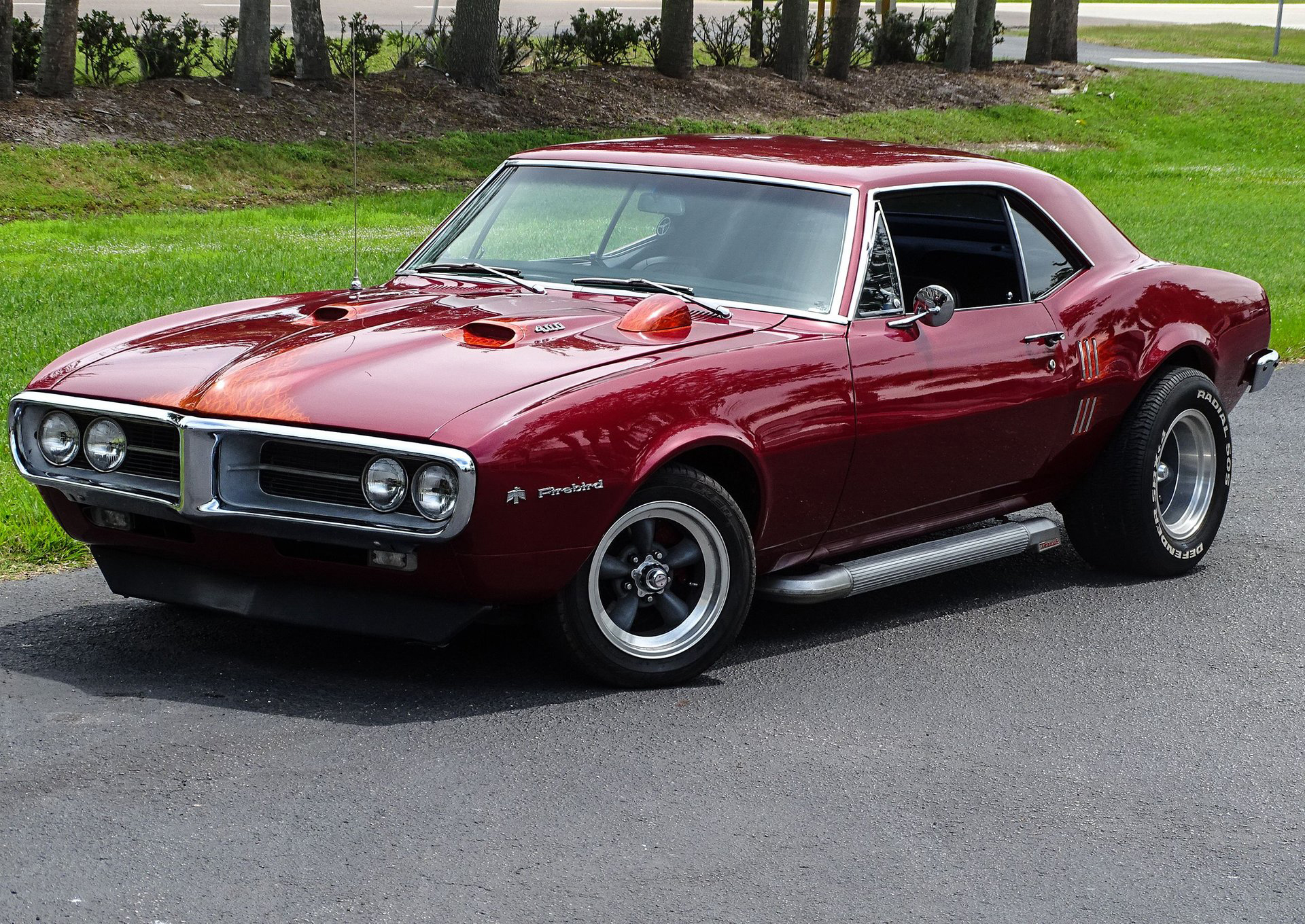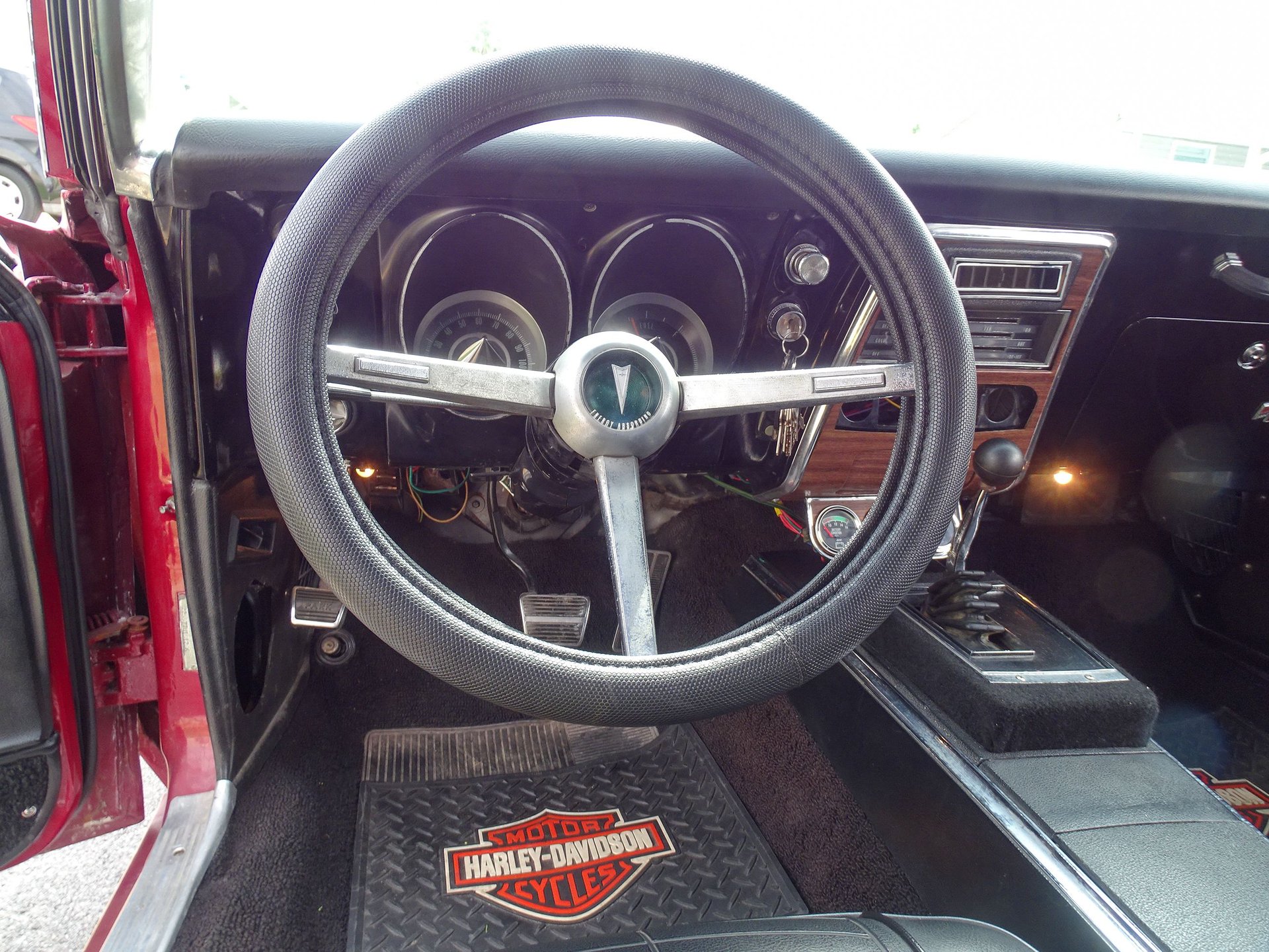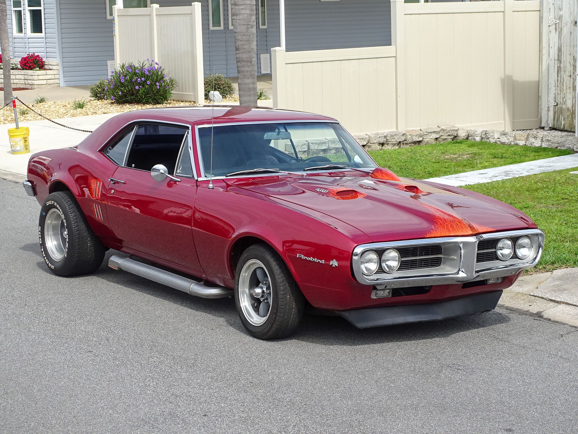 First Generation Firebirds are incredibly cool and have been gaining in value and appeal in recent years. They are the sister car to the Chevrolet Camaro but have a look that is uniquely their own. The chrome grill with dual headlights on each side scream 1960s muscle car! In the rear the taillights are also different from the Camaro and are divided with a Firebird emblem and Pontiac badging. It has a sex appeal that ties in nicely with the sleek look achieved by the front spoiler and rally wheels. Firebird script on the fenders and Firebird emblems on the quarter panels ensure people will know what they're looking at from any angle. Under the hood is a 383 Stoker CID V8 engine with a 4 barrel carburetor connected to an automatic transmission running to a 10-bolt rear end to complete its powertrain assembly. This Firebird has full-length headers and side pipes. Inside is complemented with Midnight black interior and comfortable bucket seats. The Firebird is simple and clean, painted in a gloss red complimented with painted orange ghost flames. Under the hood is raw power with a 383 Stroker engine and side exhaust pipes to give an aggressive stance while turning heads. The Firebird has a great classic muscle car sound to go along with the stance, body lines and wheels. Red gloss paint with ghost flames is always good on a classic car and the black interior plays very well off of it.
