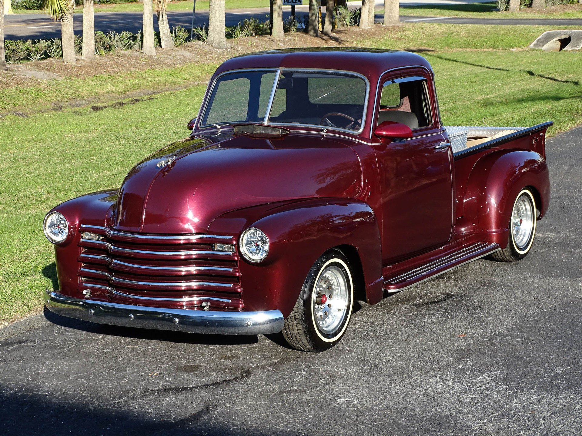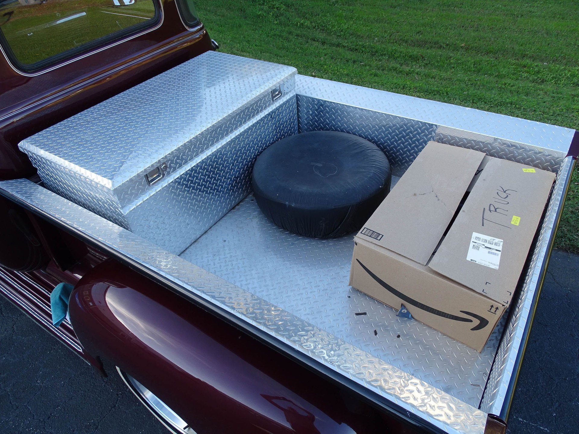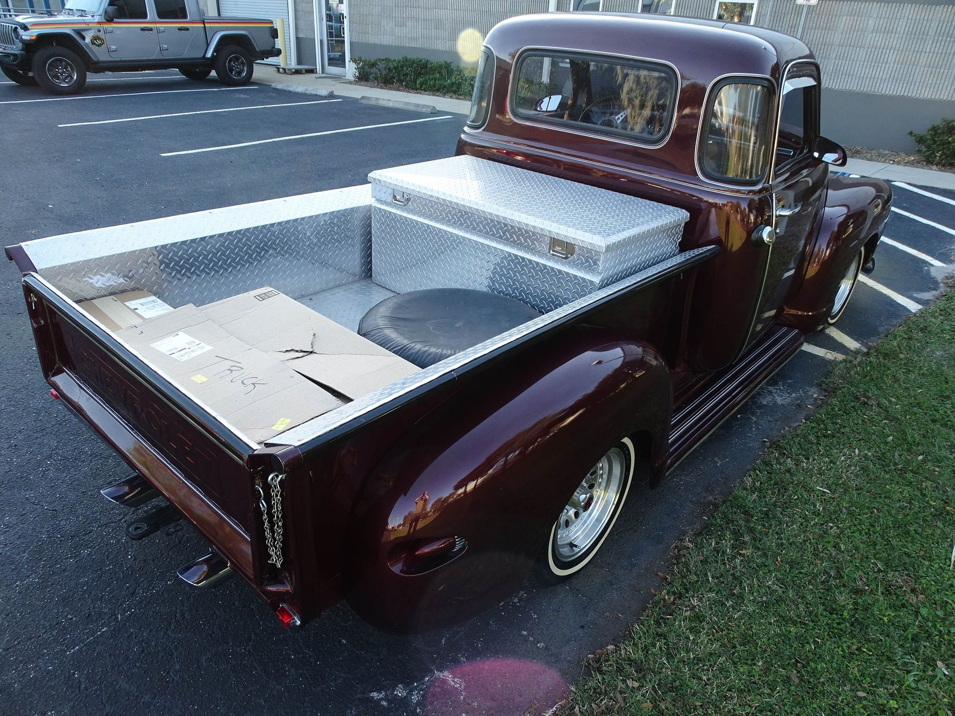 The bed has ample storage with a large diamond plate toolbox, and the inside of the bed is covered in diamond plate as well which not only looks great, but makes this bed much more usable than a painted one. Alloy wheels are wrapped in white wall radial tires bringing a modern touch to the exterior. There are several custom touches on this truck, but most noticeable are the 1959 Cadillac taillights that have been frenched into the rear fenders! The headlights are also frenched in with tri-bar headlights, and a Jaguar hood ornament has been added up front. Chrome front bumper, a painted grill, and a roll pan out back finish off the exterior in style. This is an older build that has been garage kept and carries a clean Florida title. A brand new carburetor was just installed, along with other normal maintenance items like fluids, draining the fuel tank and putting in fresh gas with stabilizer, and a tune up.