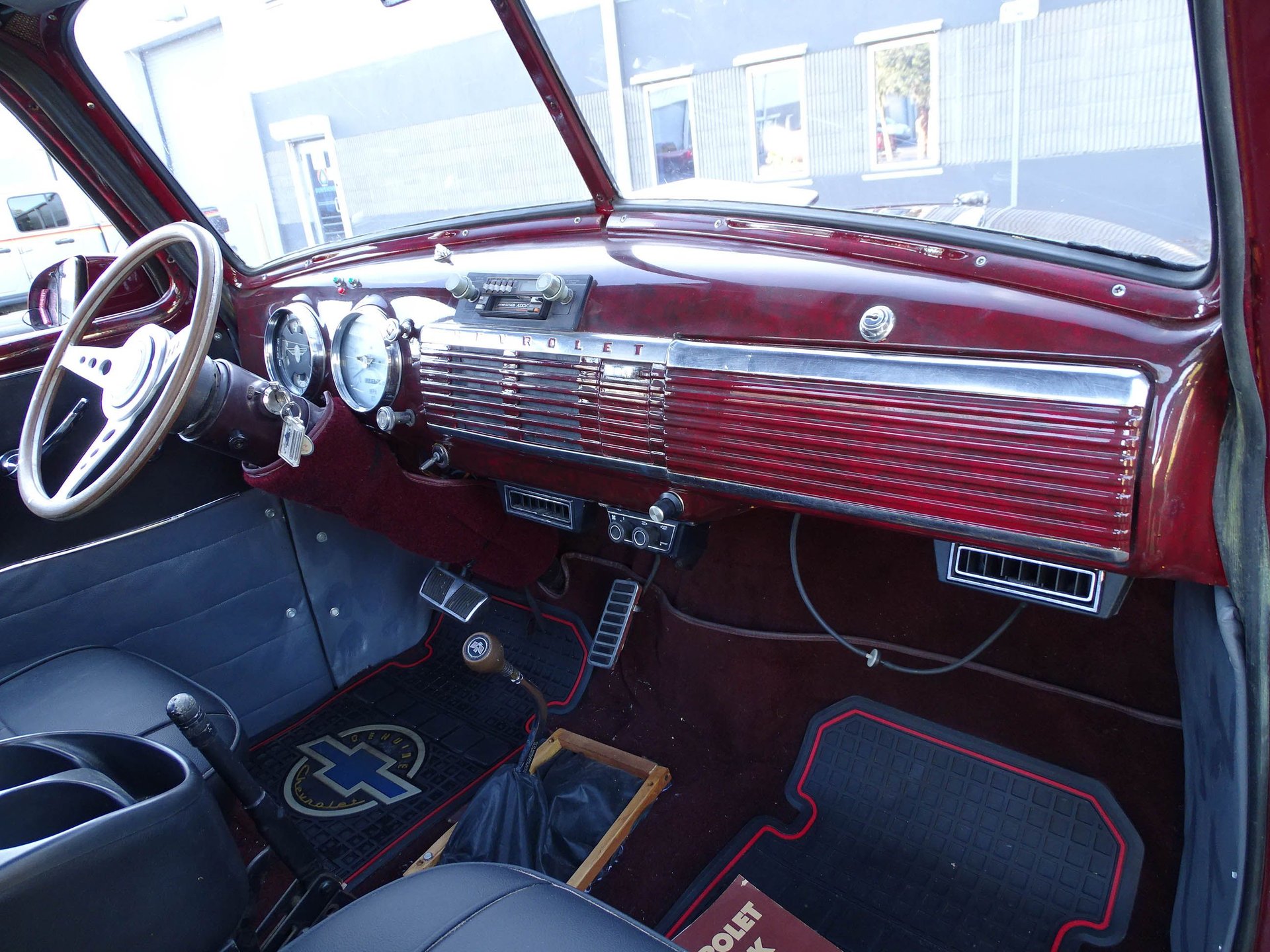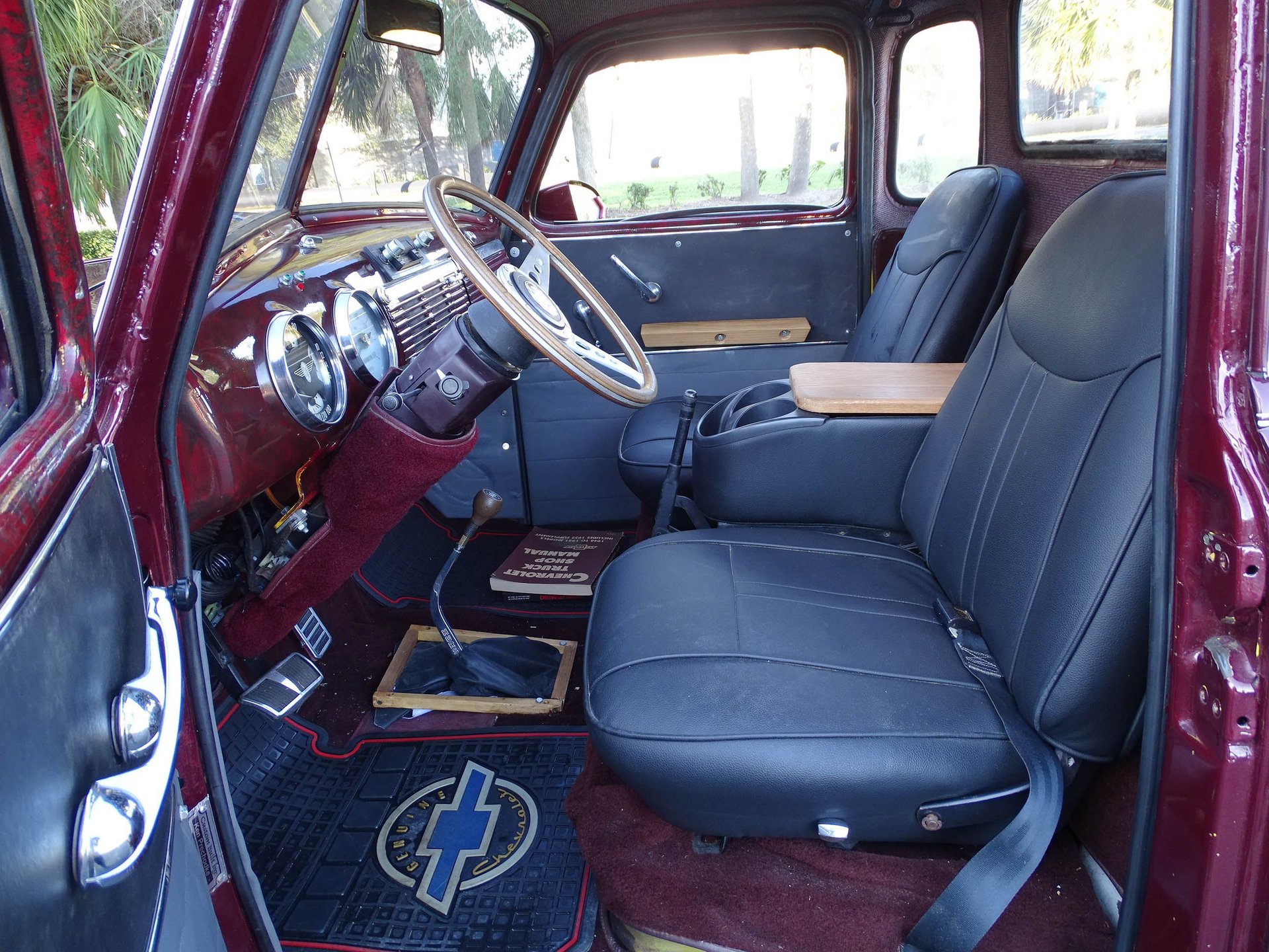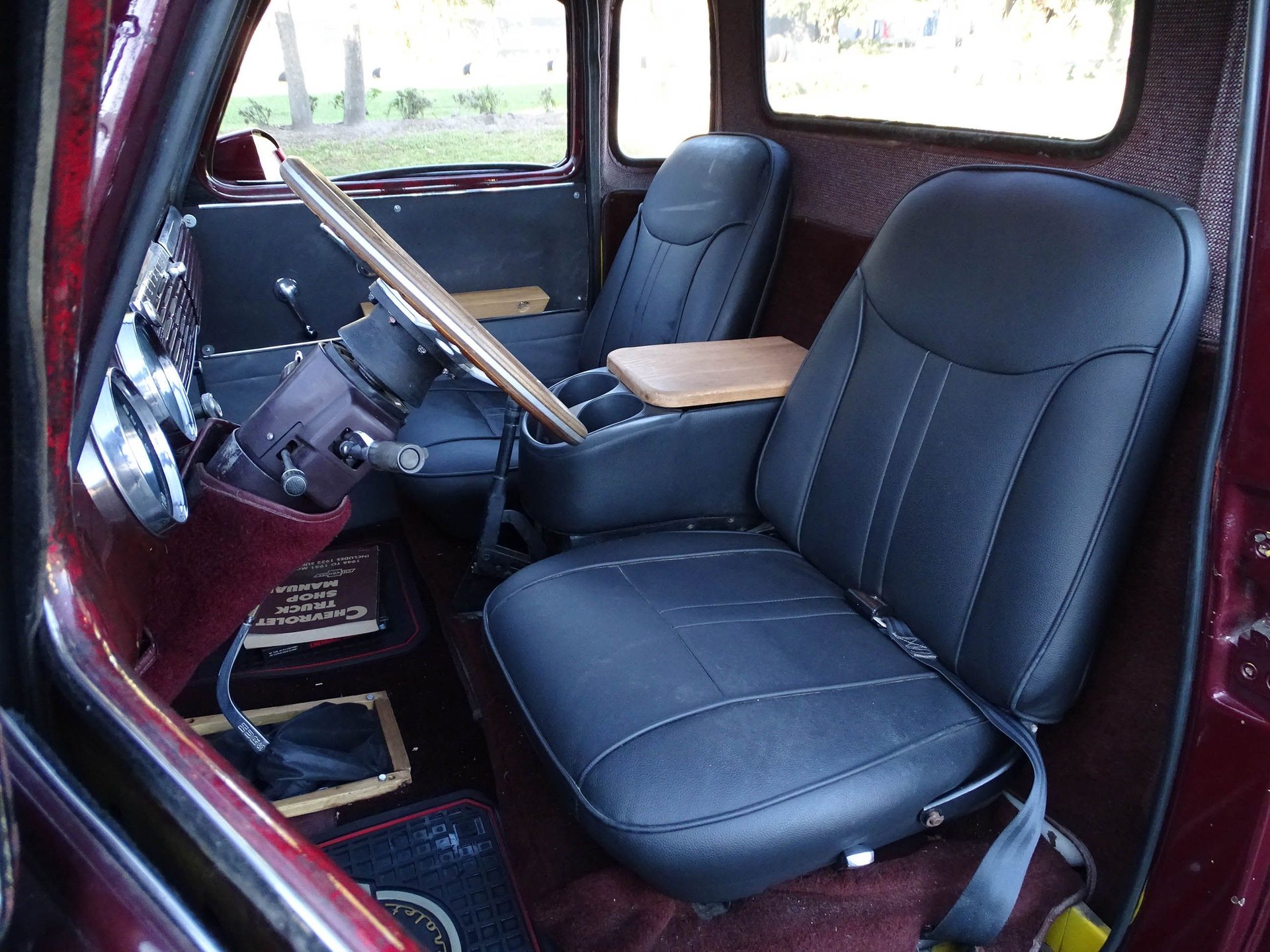 The engine is backed by a 3-speed automatic and highway friendly gearing. Inside you will find bucket seats, a tilt steering column, AM/FM/Cassette player, and a combination of vinyl and cloth between the seats, door panels, headliner, and rear paneling of the truck. A Corvette style wood steering wheel looks great in front of a white face Stewart Warner gauges. The dash and window trim are done in a marbled look with the same Black Cherry color paint. It is a really classy touch.