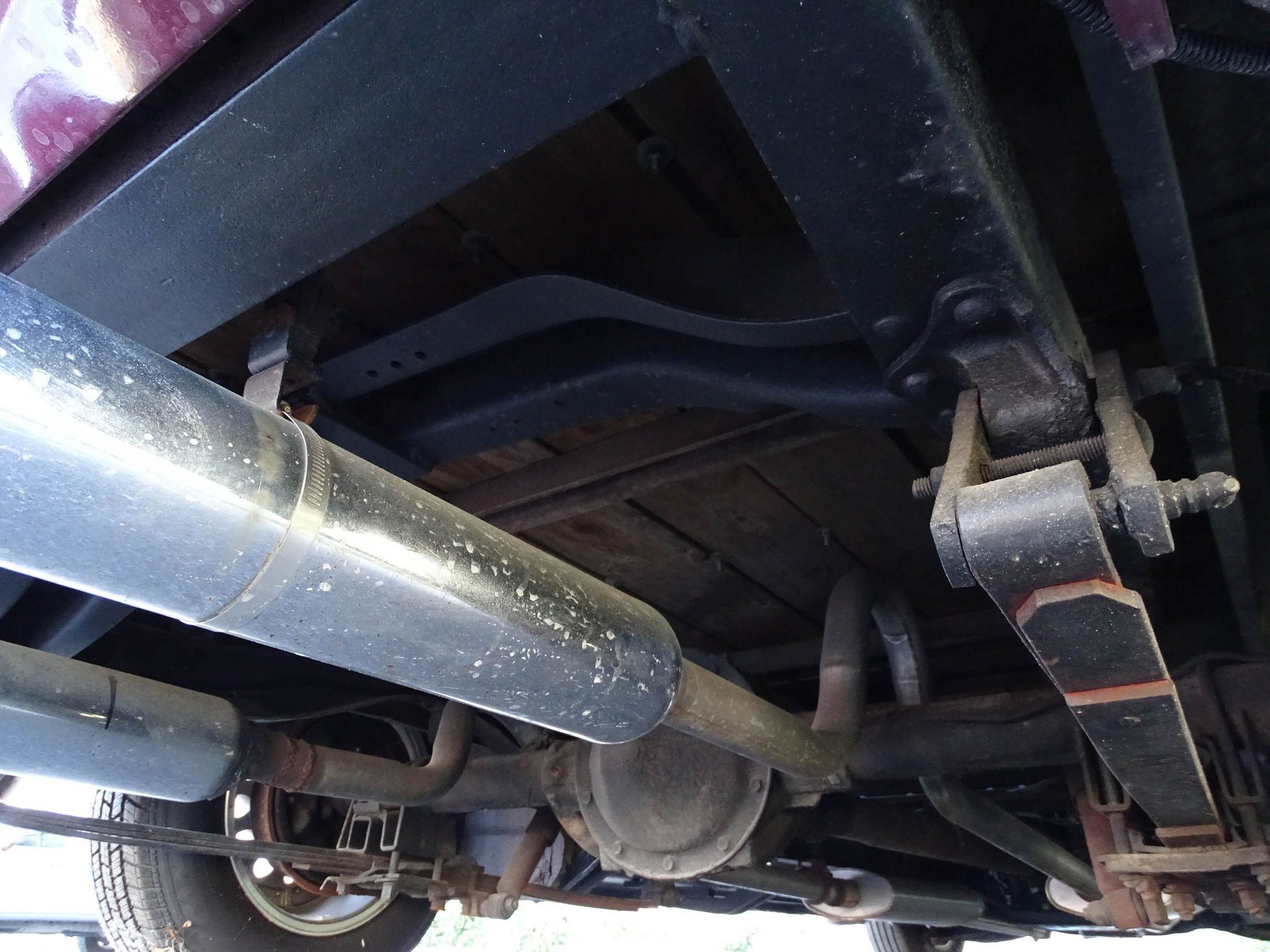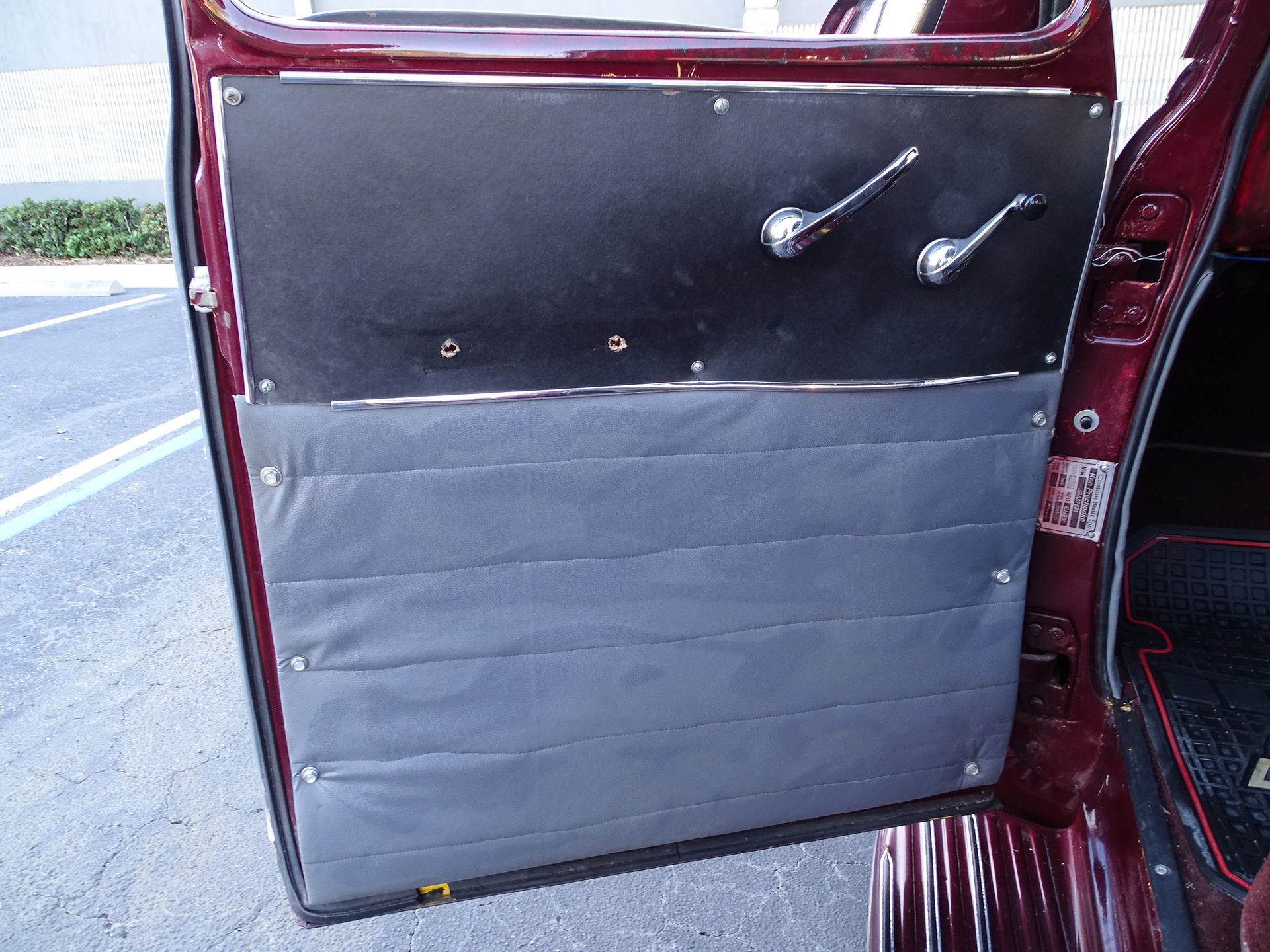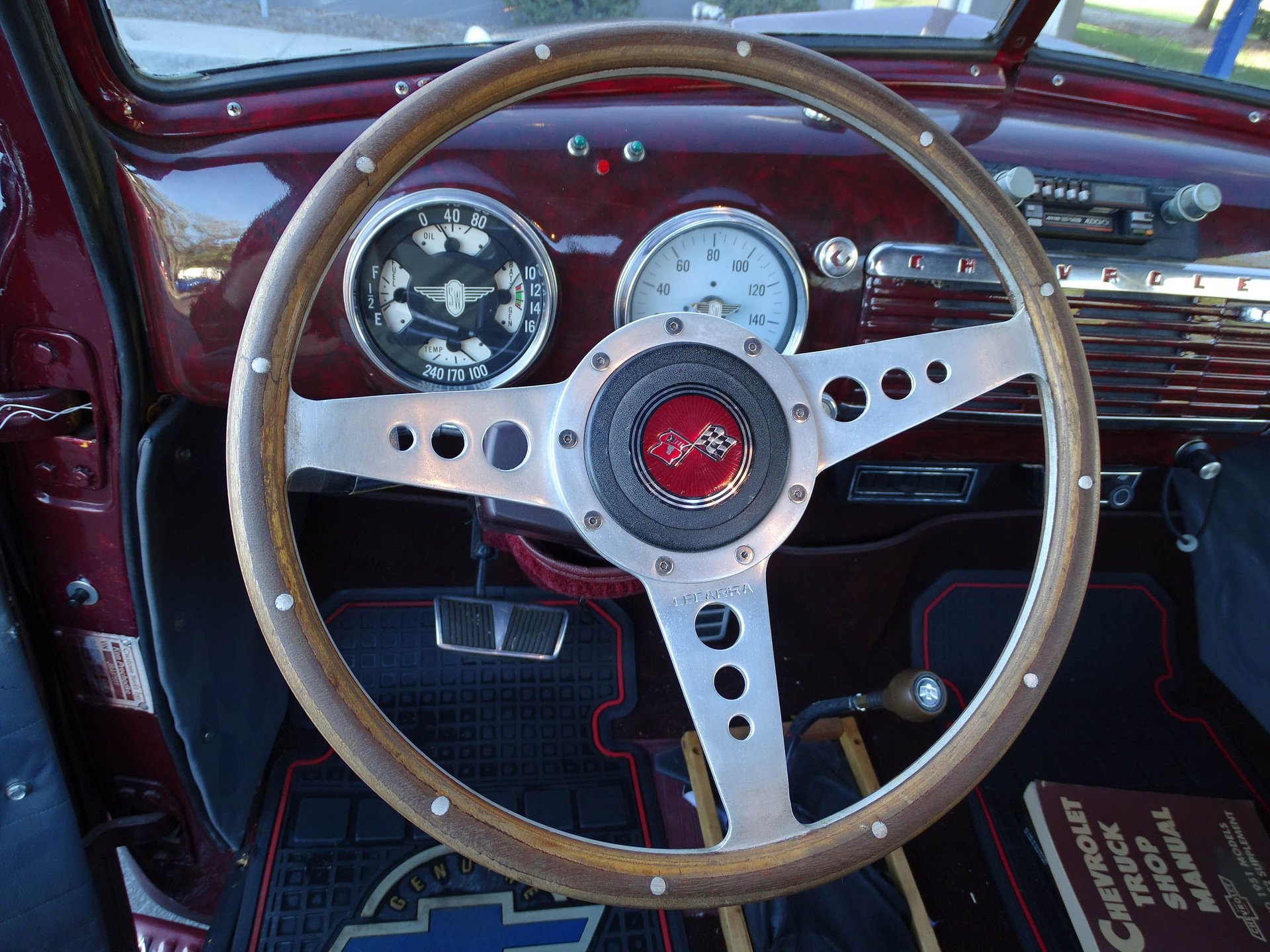 The engine is backed by a 3-speed automatic and highway friendly gearing. Inside you will find bucket seats, a tilt steering column, AM/FM/Cassette player, and a combination of vinyl and cloth between the seats, door panels, headliner, and rear paneling of the truck. A Corvette style wood steering wheel looks great in front of a white face Stewart Warner gauges. The dash and window trim are done in a marbled look with the same Black Cherry color paint. It is a really classy touch.