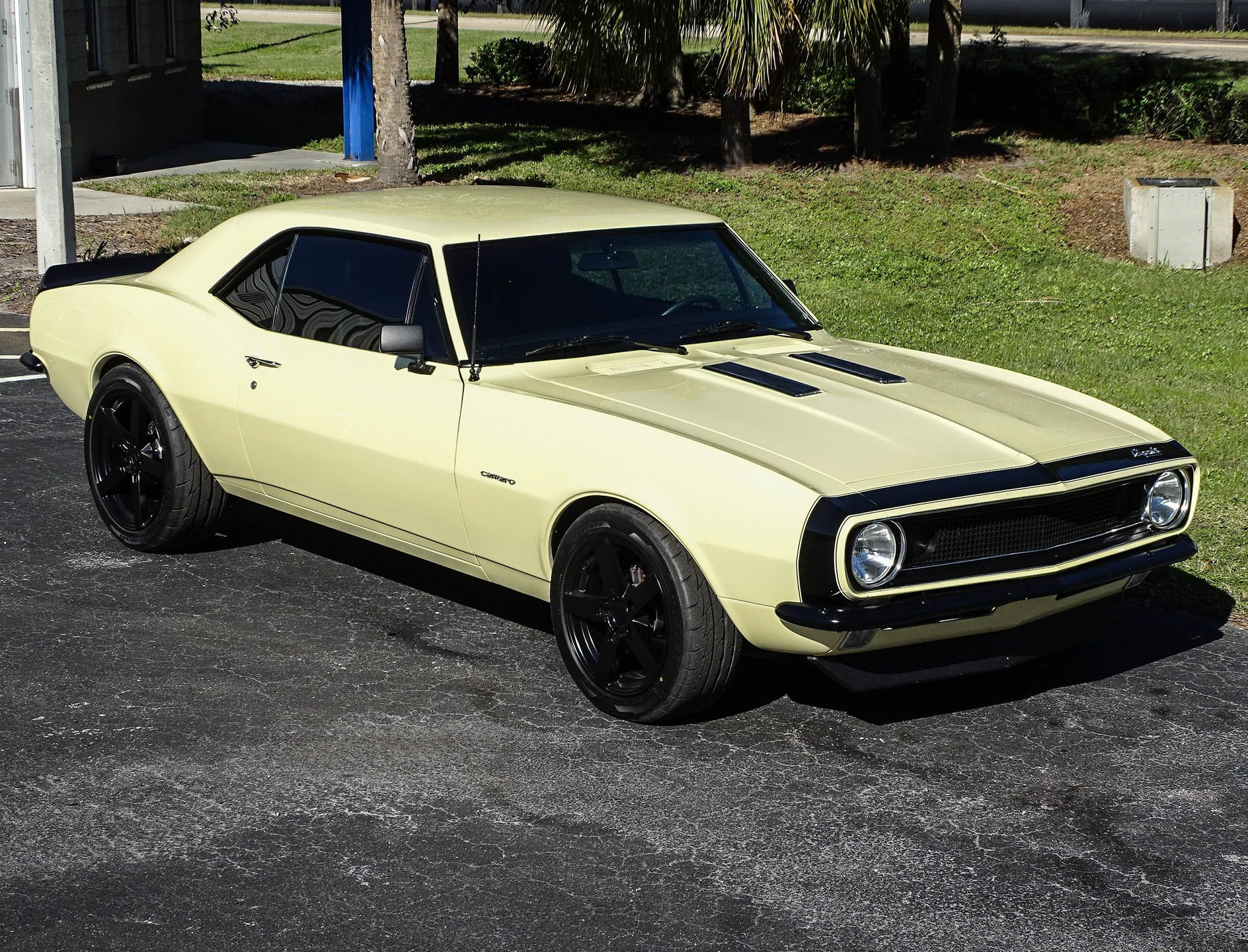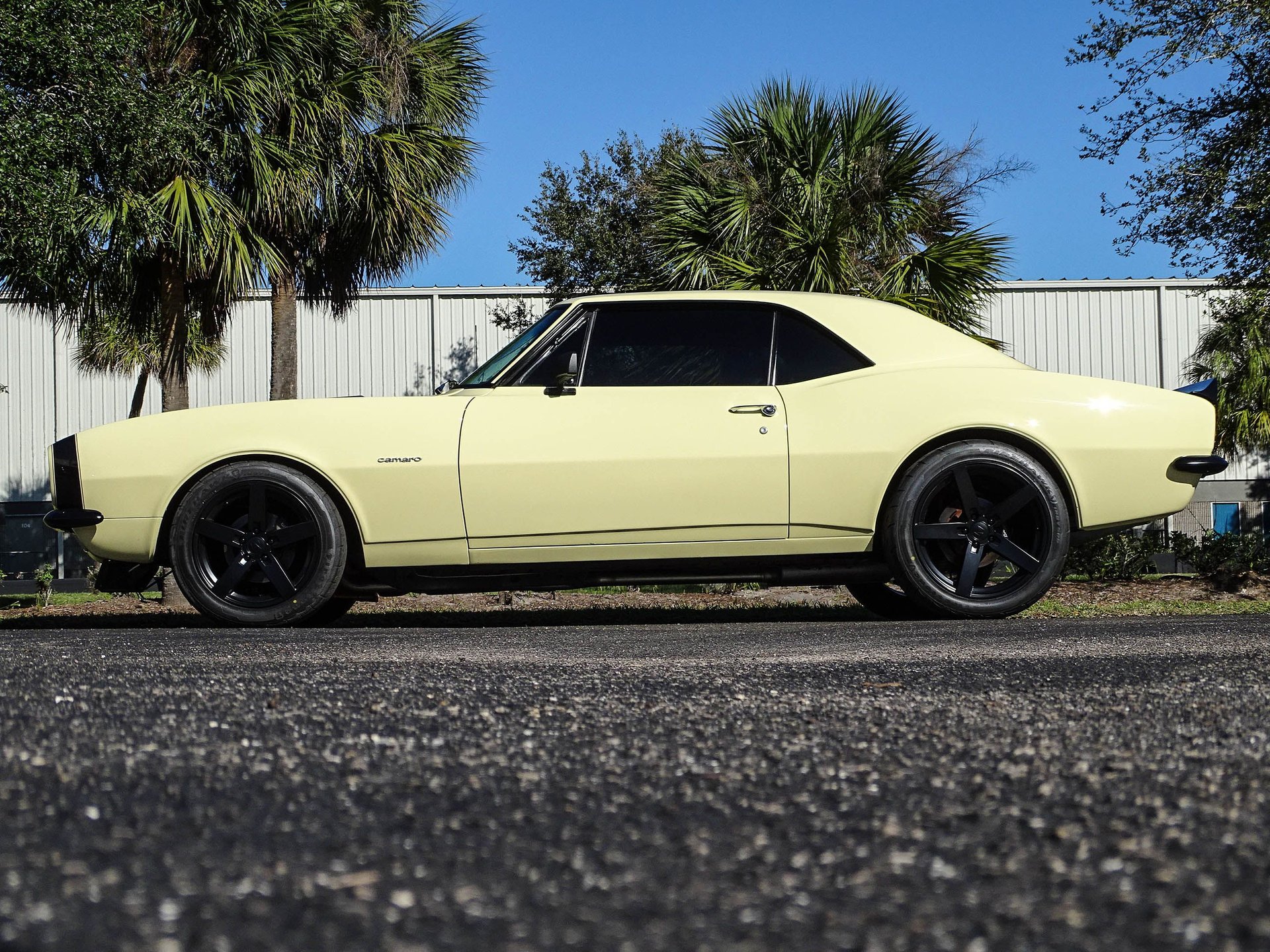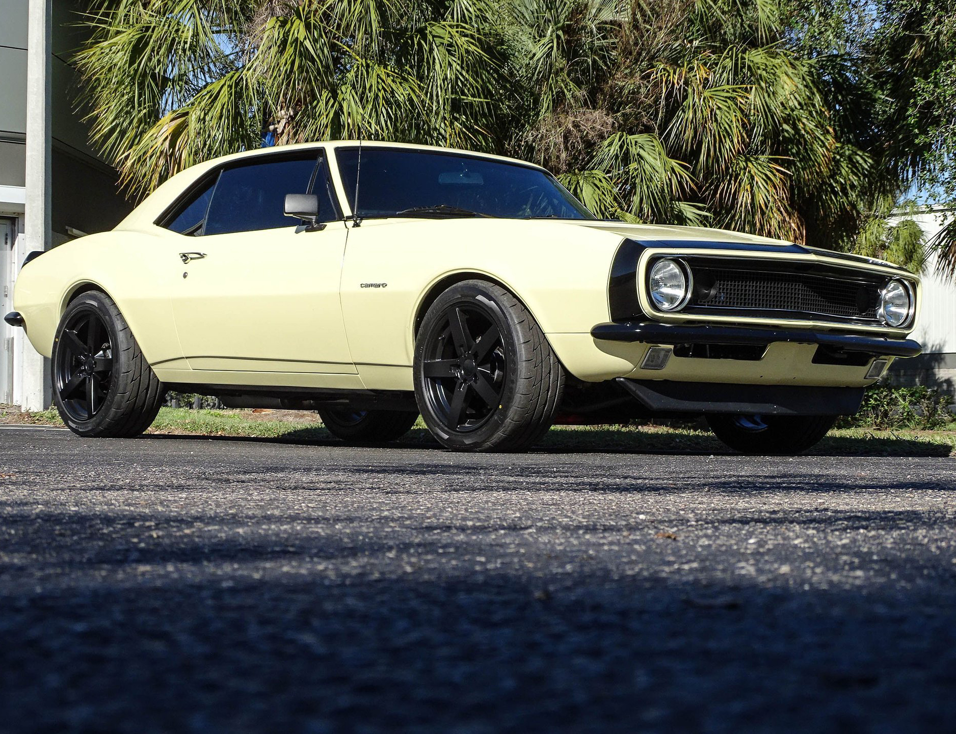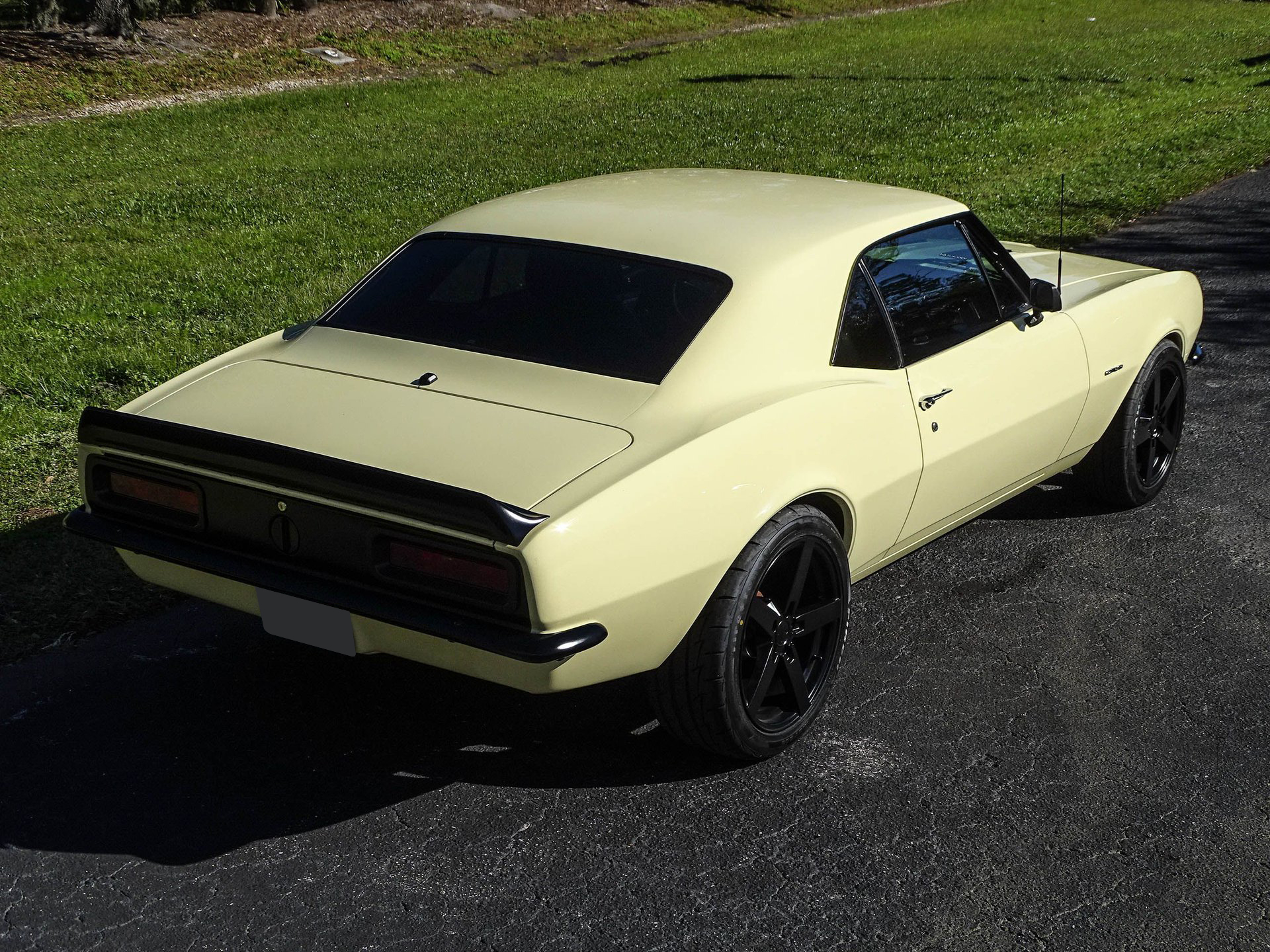 Starting with the exterior, this 67 Camaro has a distinctly modern look with the satin black Mandrus Arrow staggered alloy wheels in 17x8 up front and 19x9.5 in the rear. Match that with blacked out trim, ceramic tinted windows, a black spoiler, black nose stripe, and bumpers and you've got a great combination of classic and absolutely sinister looking! Dual beam LED headlights and LED taillights ensure you are seen, as if everyone won't already be staring! The paint color is Butternut Yellow, which is the color this Camaro left the factory wearing.