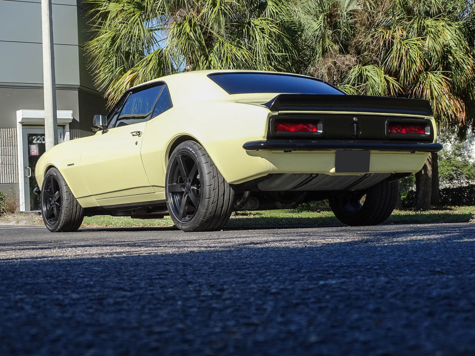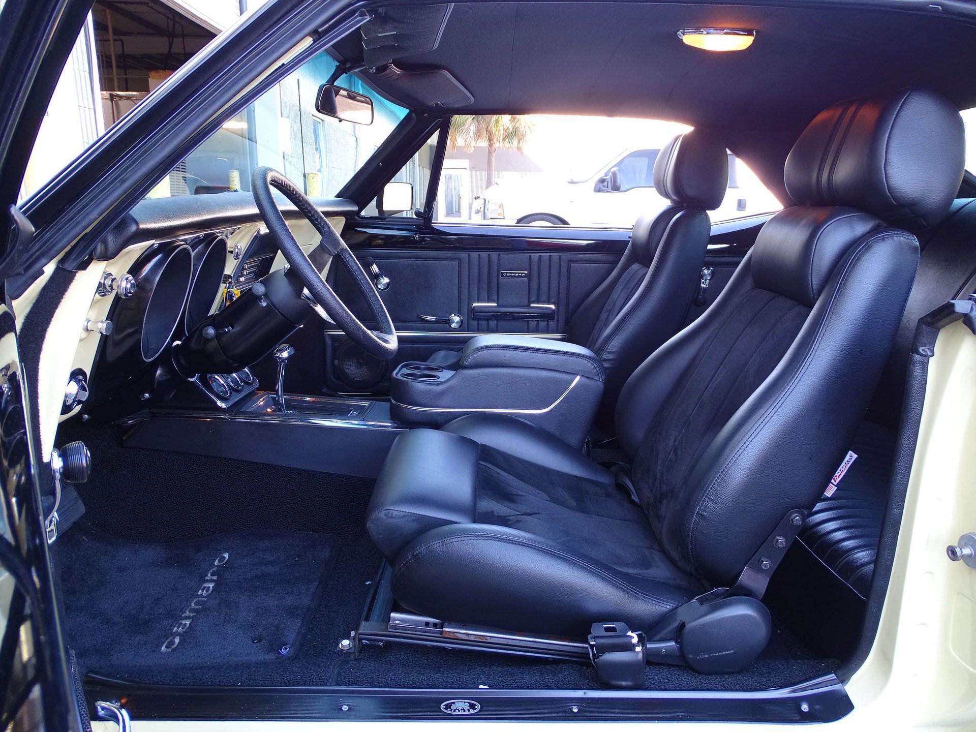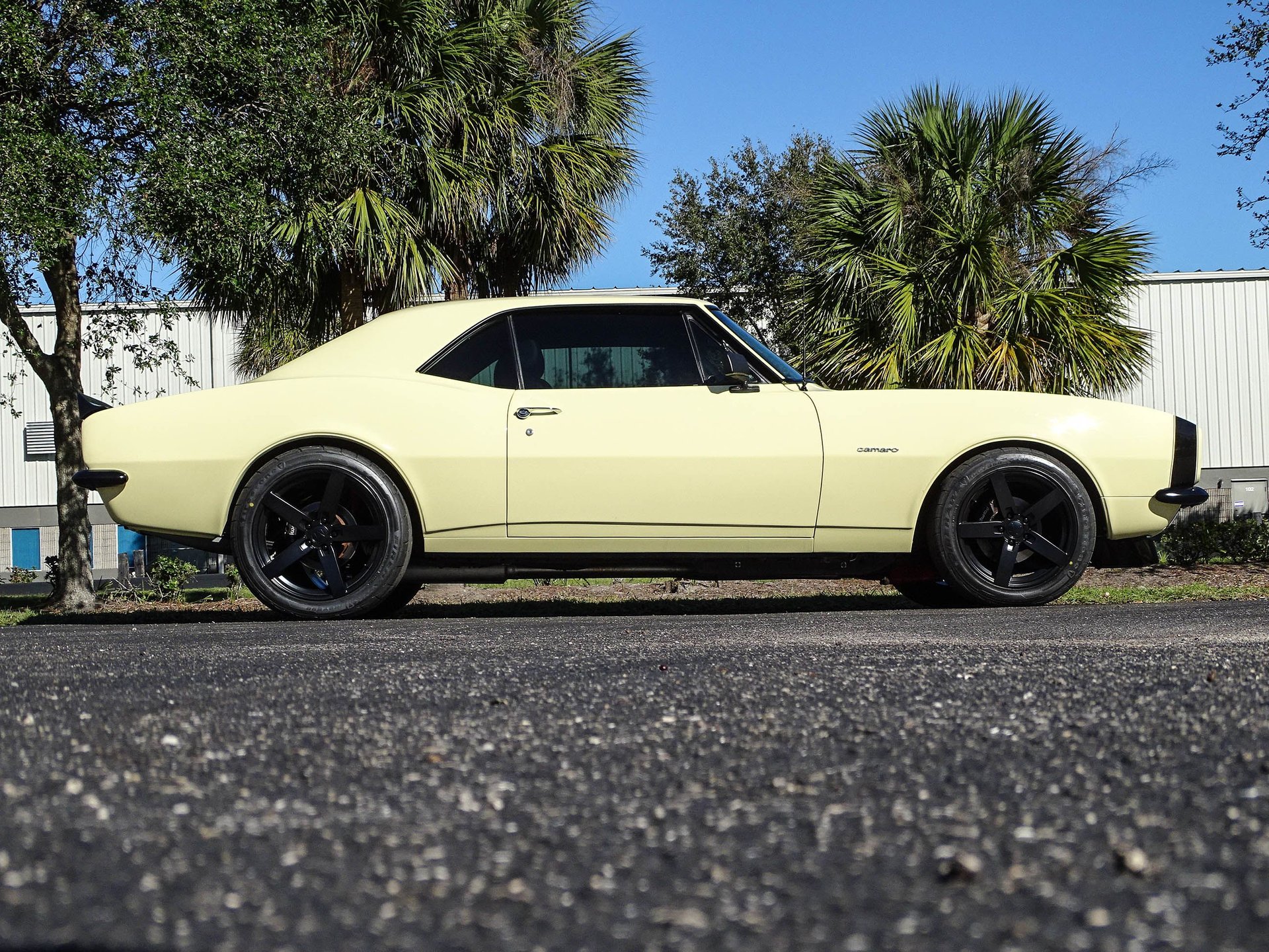 Starting with the exterior, this 67 Camaro has a distinctly modern look with the satin black Mandrus Arrow staggered alloy wheels in 17x8 up front and 19x9.5 in the rear. Match that with blacked out trim, ceramic tinted windows, a black spoiler, black nose stripe, and bumpers and you've got a great combination of classic and absolutely sinister looking! Dual beam LED headlights and LED taillights ensure you are seen, as if everyone won't already be staring! The paint color is Butternut Yellow, which is the color this Camaro left the factory wearing.