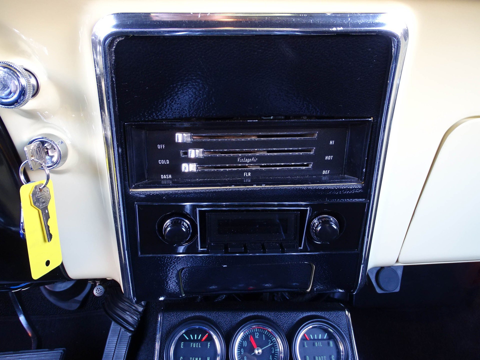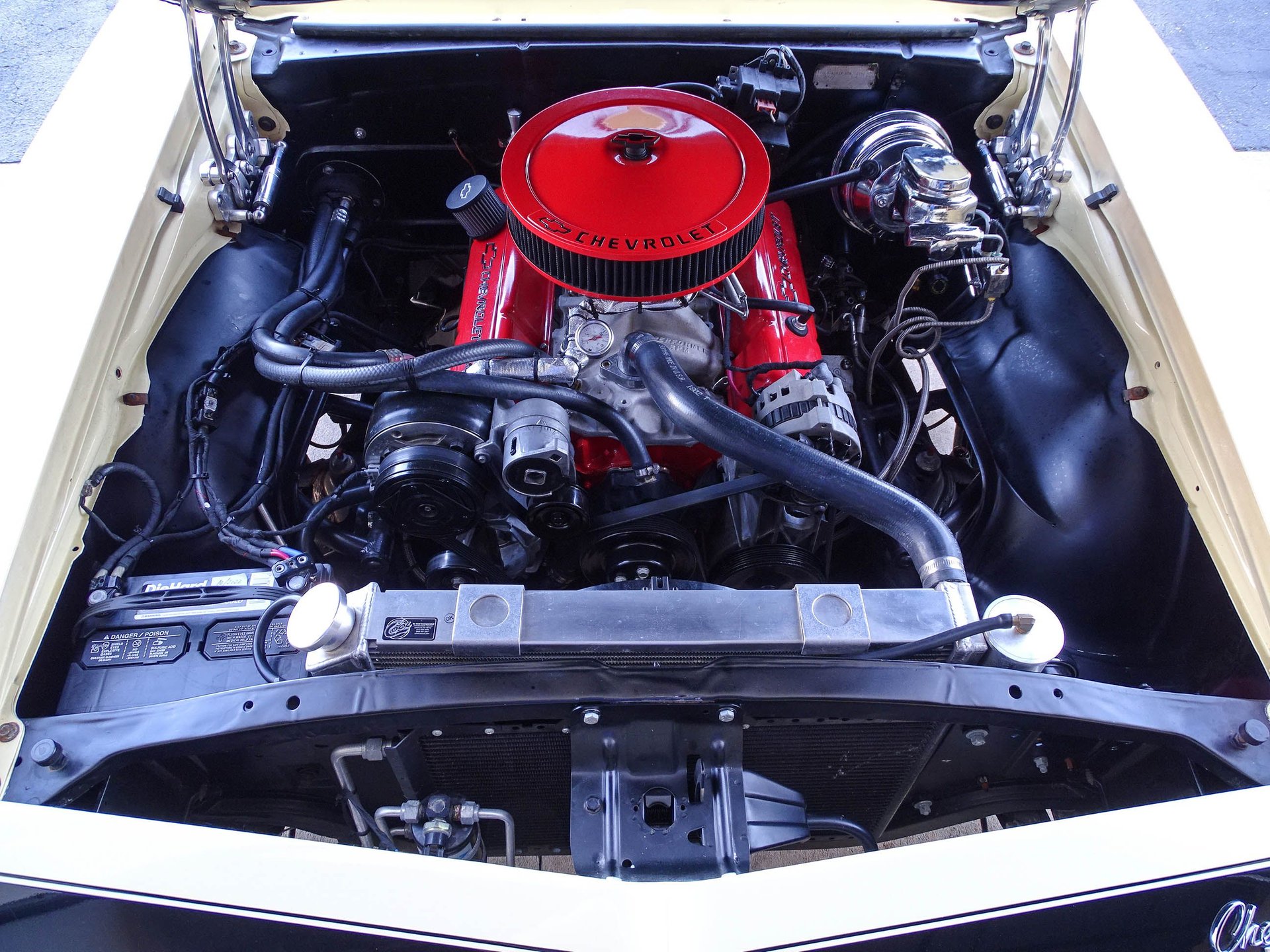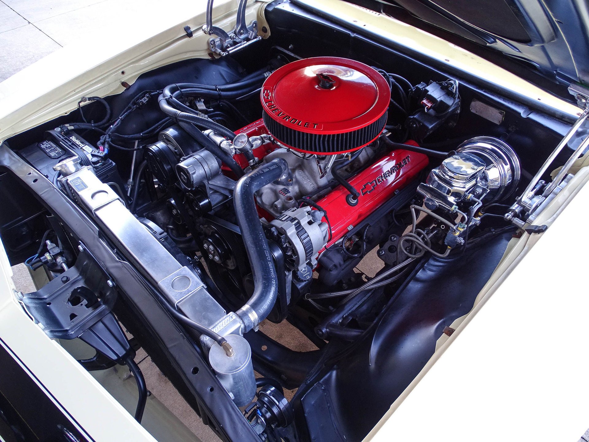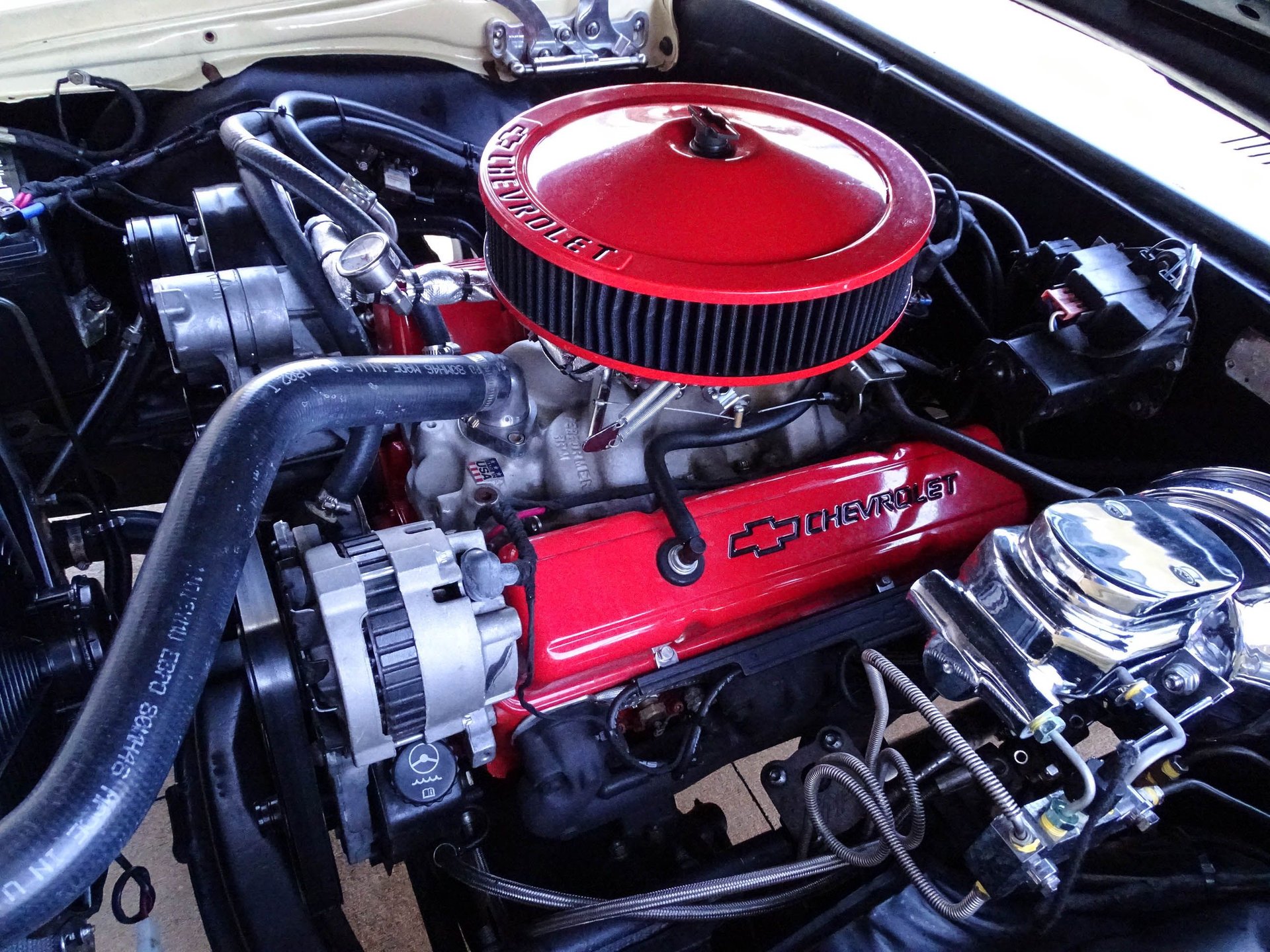 Under the hood rumbles a built 350 CID V8 with Edelbrock aluminum intake, Holley 600 CFM 4-barrel carburetor, HEI distributor, Vintage A/C and heat system, BeCool aluminum radiator with SPAL electric fan, a billet serpentine belt system, and Flowmaster dual exhaust! Bump the key and fall in love with the classic Flowmaster sound from this well-built small block Chevy V8. The engine is paired to a cruiser friendly 200R4 four-speed automatic transmission. A 12-bolt rear end puts that power to the ground with the help of Hotchkis shocks and 3.08 gears. Under the hood has plenty of eye candy as well with Leed chrome master cylinder, Leed chrome power brake booster, Leed adjustable proportioning valve, under hood insulation package, billet hood hinges, and an engine dress up kit.