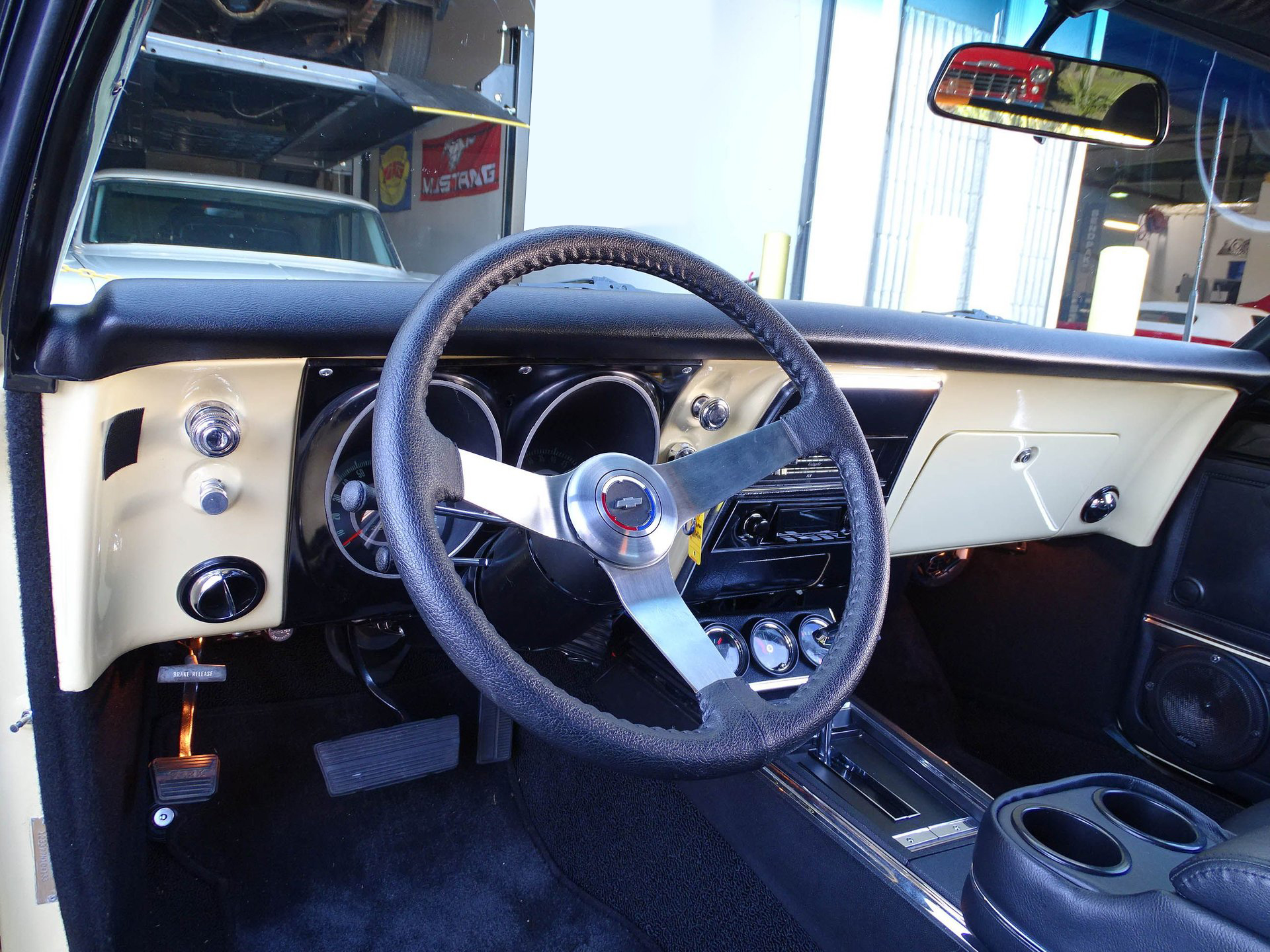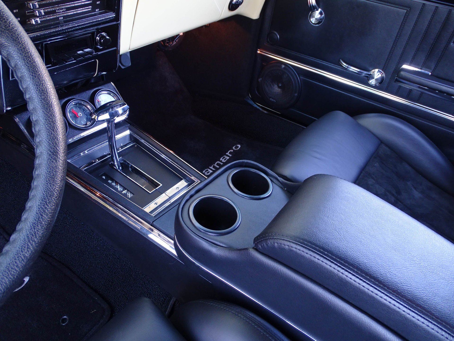 Pop the door and you will be blown away by the attention to detail inside, and how the modern feel continues into the car. Cerullo leather and suede bucket seats are paired with a center console with RS gauges, tilt steering column, retro Sirius/XM radio, M. Mats 1,000 watt stereo system, Lloyd Ultimate floor mats, and a custom arm rest and console combination. That show quality finish is carried into the trunk with a TMI trunk finish kit.